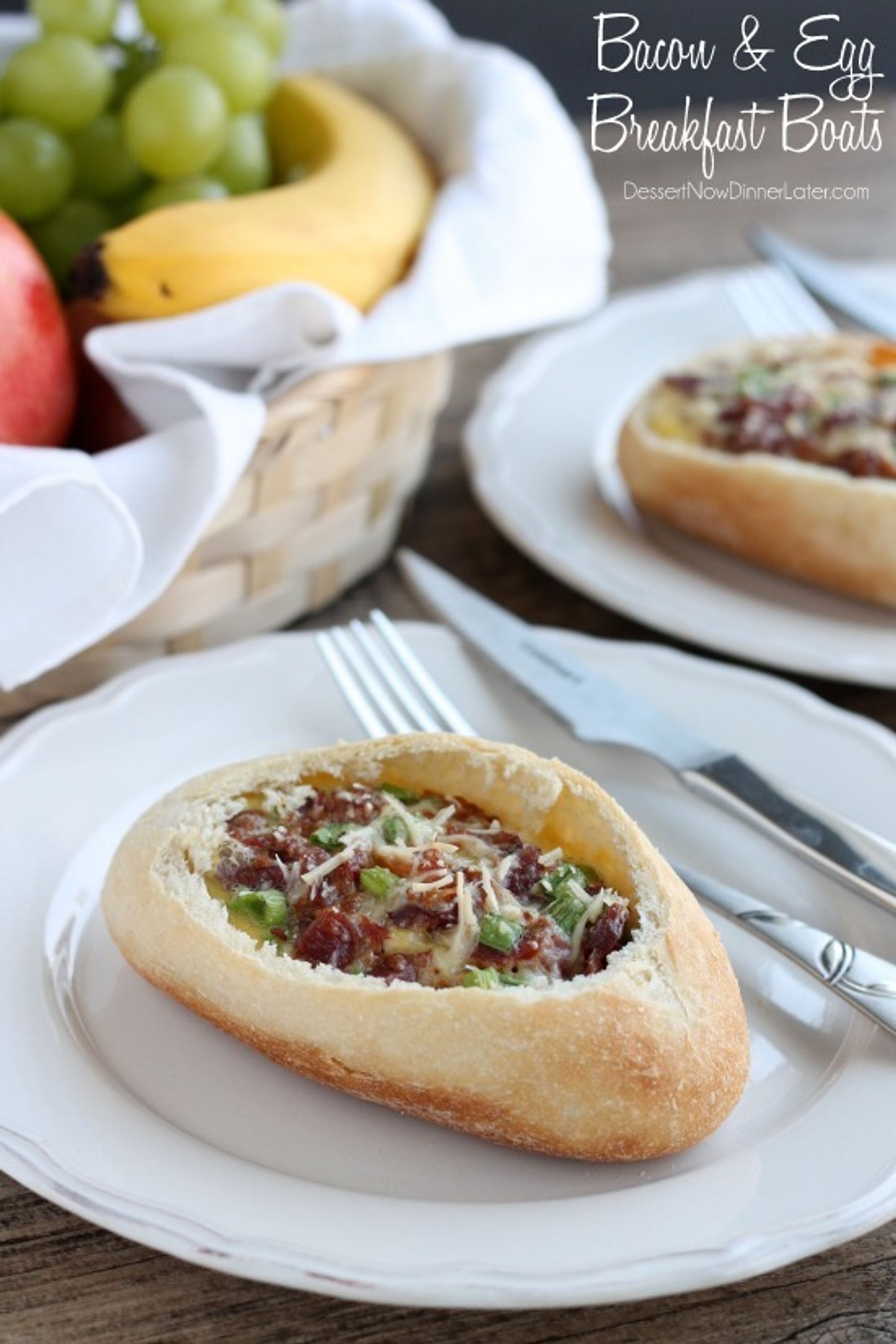 These Bacon and Egg Breakfast Boats are simply made with store bought mini-baguettes, real bacon bits, eggs, a little heavy cream, cheese, green onions and a little seasoning.