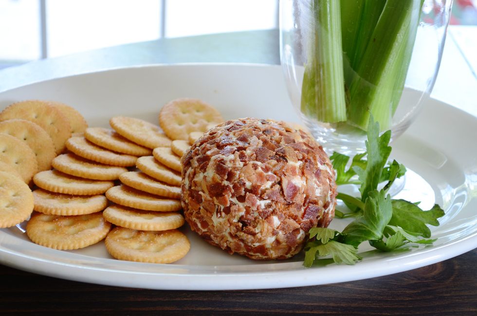 The flavors of ranch and bacon have been combined with a whipped cream cheese to form a delicious and creamy cheese ball.