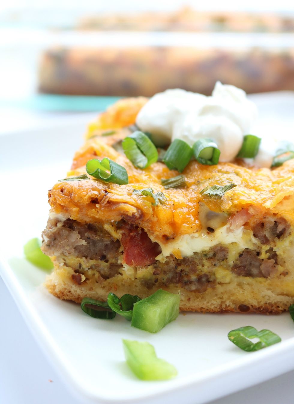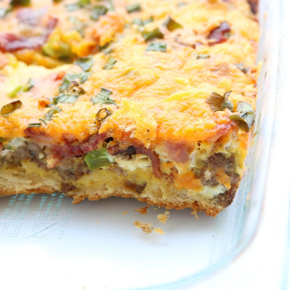 This breakfast casserole is loaded with your favorite meat and layered with egg and cheese over a crescent crust.