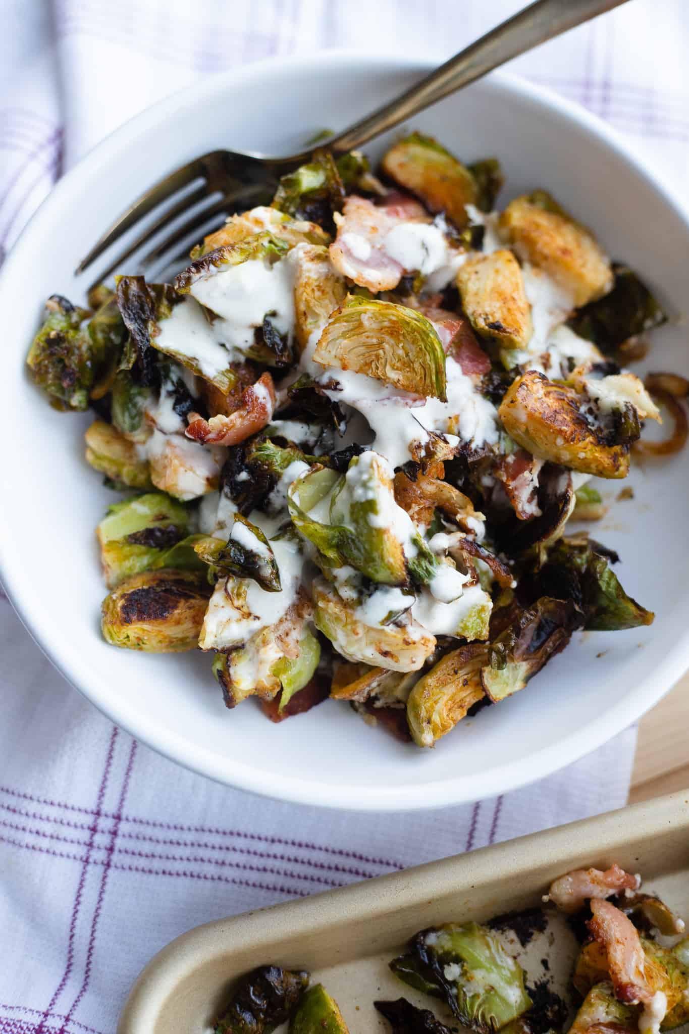 For this easy side dish, I roasted brussels sprouts, bacon, and sliced onions on a sheet pan, then drizzled it all with a super easy homemade caesar dressing. It’s a delicious and fun twist on two different dishes. Find the recipe here!