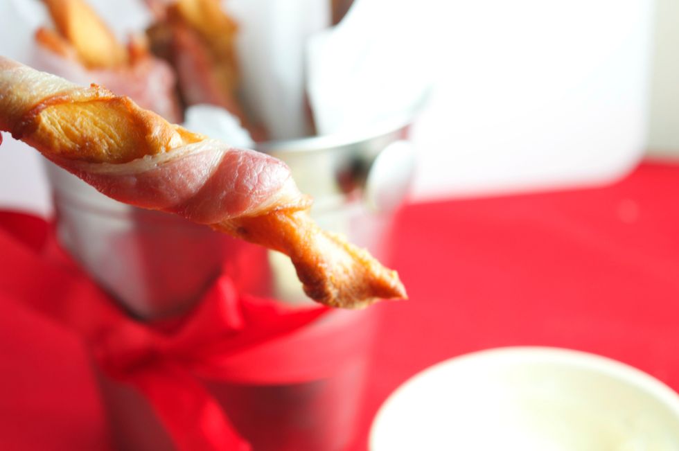 Twist the bacon strips around the cheese twists.