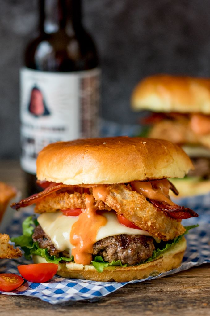 Bacon Cheeseburger with Baked Parmesan Onion Rings – this is what I call a proper burger!