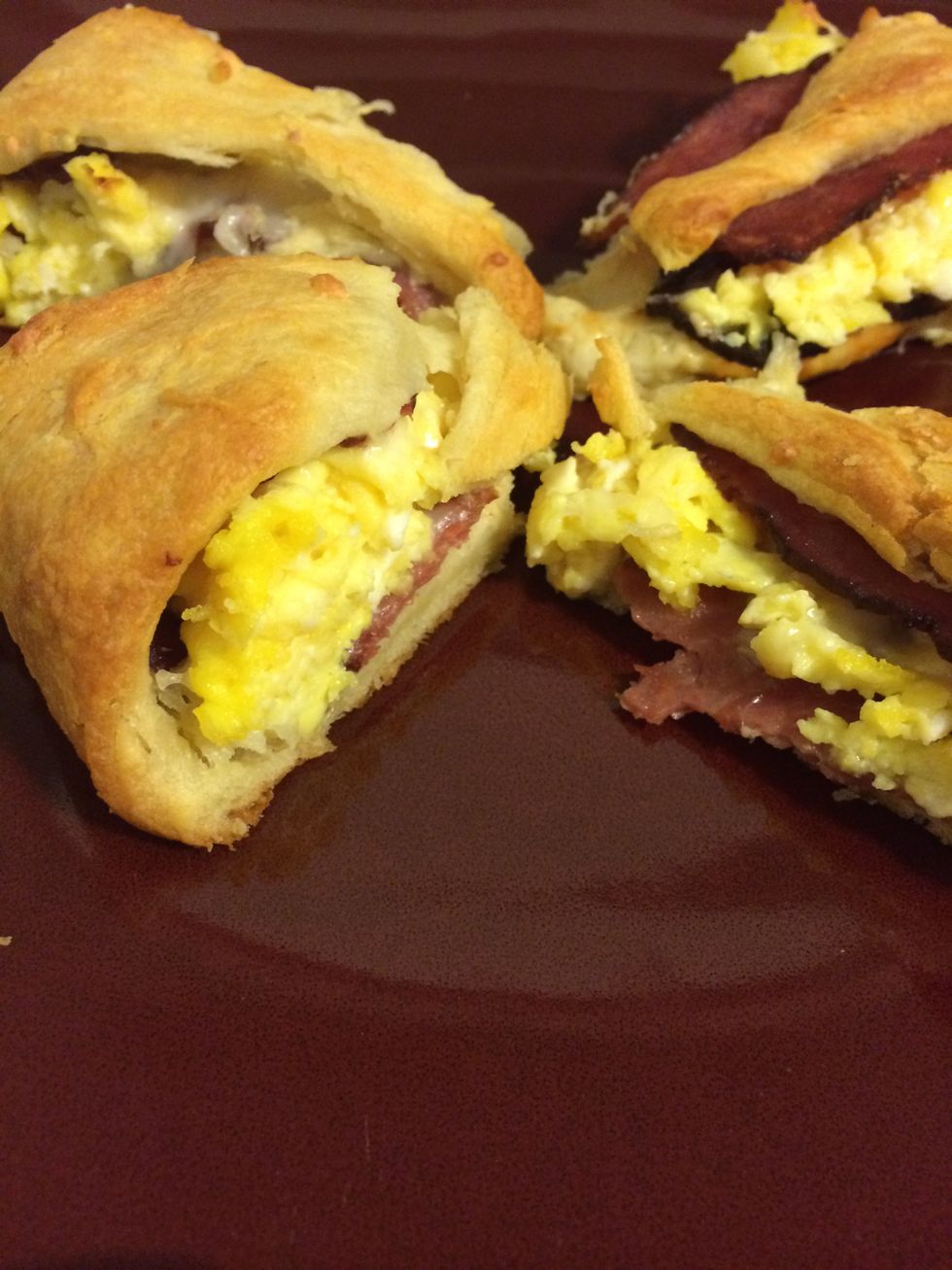 Heat oven to 375 degrees. Scramble eggs on stove top. Lay out crescents on a parchment lined pizza pan in a star formation (the longer sides of each crescent on the inside with the pointed ends pointing...