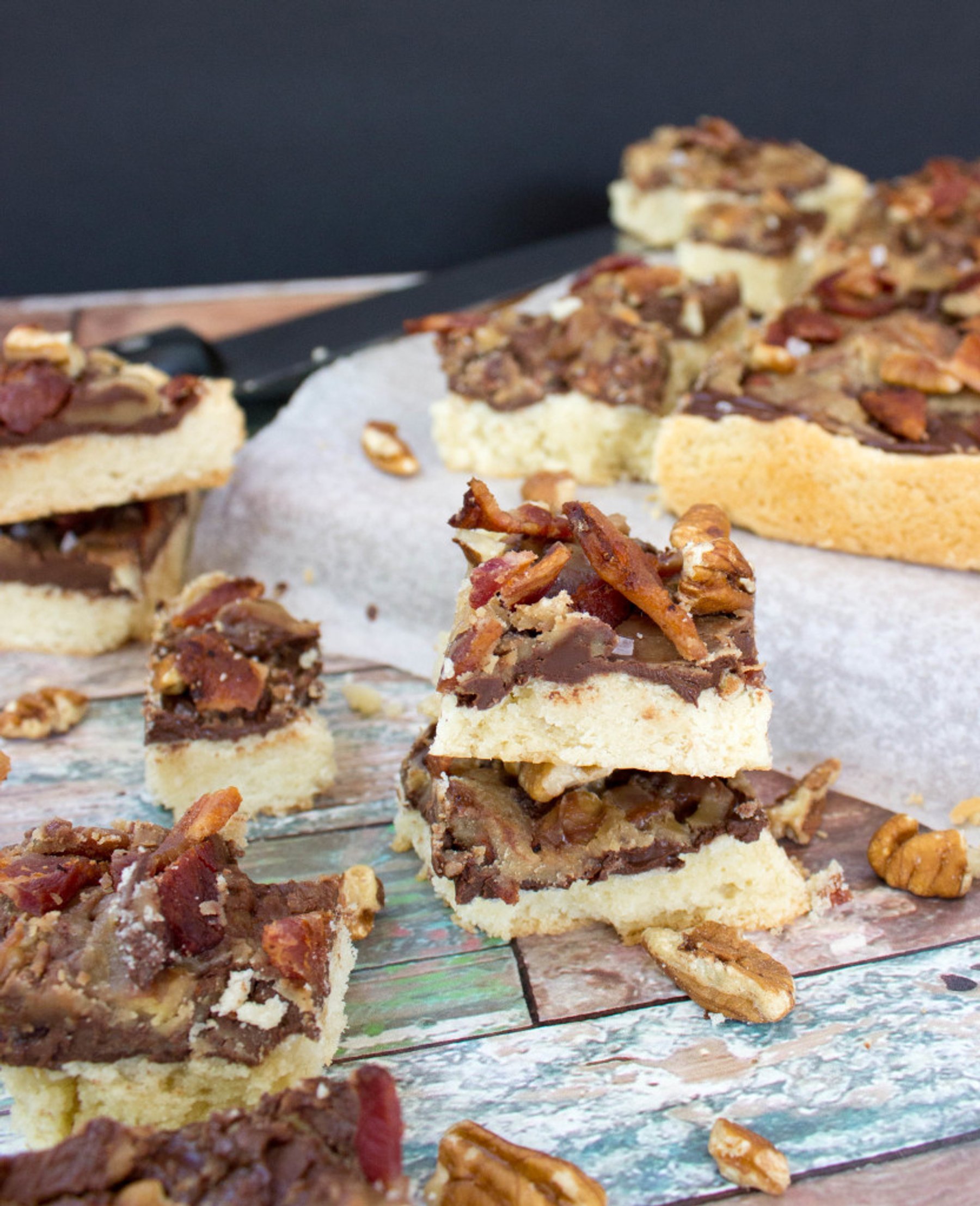 Sweet and salty. Crisp and soft. Chocolate and bacon. These shortbread bites are (probably) unlike anything you’ve ever tried before and promise to satisfy both your sweet and salty taste buds. With semisweet chocolate swirled into bacon-infused praline candy over a soft shortbread, I recommend slicing these into small, bite sized squares and serving as you would candy.
