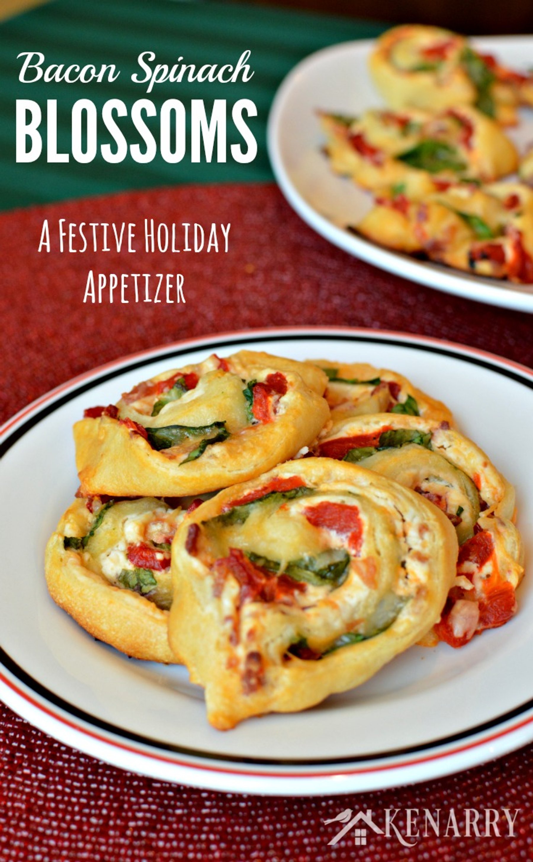 Great for Christmas cocktail parties! Bacon Spinach Blossoms with roasted red peppers and Italian cheeses are a festive holiday appetizer.