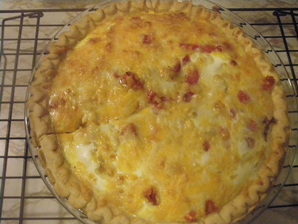 A different take on a quiche, this dish is creamy, slightly cheesy and full of flavor. Bacon and caramelized onions work together to create a smoky, savory flavor and the tomato adds a pop of fresh to the quiche.