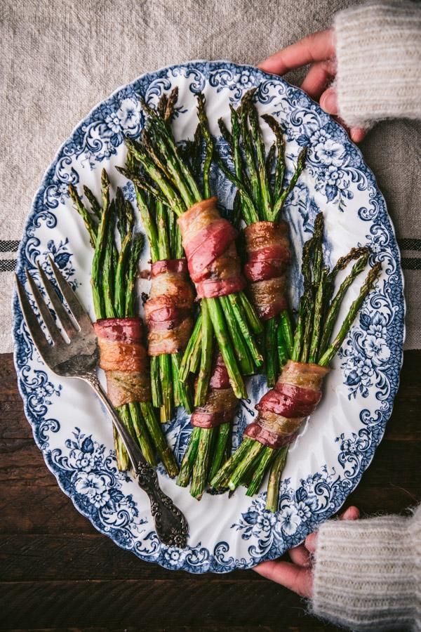 Bacon wrapped asparagus is a delicious side dish that's elegant enough for a holiday table, and easy enough for your next weeknight dinner! Fresh asparagus bundles are wrapped with salty, smoky bacon, brushed with sweet maple syrup, and ready for the oven or grill in just 10 minutes. The bacon is crispy, the vegetables are tender, and they're delicious alongside a Christmas or Easter ham, a roast chicken, or a cozy Southern meatloaf.
