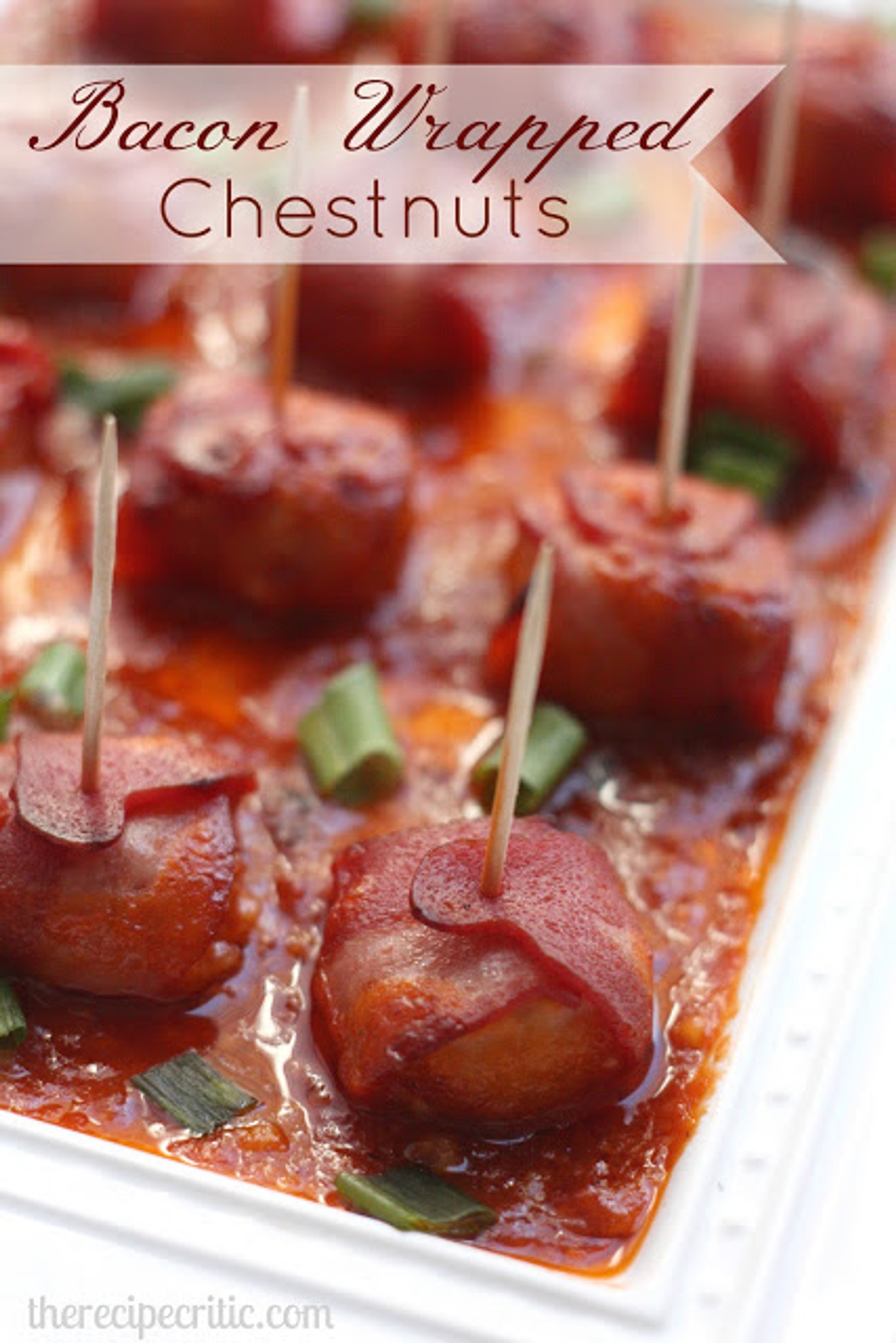 1. Cut the strips of Turkey Bacon in half. Wrap around the water chestnuts and stick toothpick in center to hold in place. Place in a 9×13 pan.