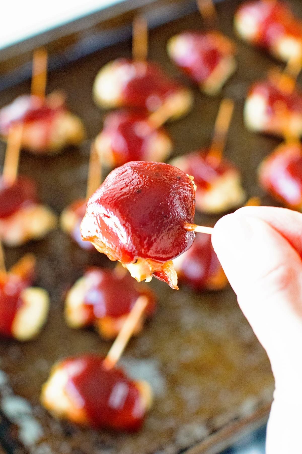 Bacon Wrapped Chicken Bites ~ Only Four Ingredients in this Small Bite Appetizer! Seasoned Chicken Wrapped in bacon and Topped with BBQ Sauce!