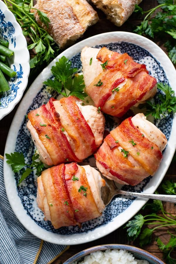 This 4-ingredient Bacon Wrapped Chicken Breast is a delicious dinner that's simple enough for weeknight meals, but also fancy enough for entertaining. Each chicken breast is stuffed with chive and onion cream cheese, wrapped with slices of bacon, and baked in the oven until crispy on the outside and juicy on the inside. Serve the perfect little bundles with rice, crusty bread, green beans or salad!