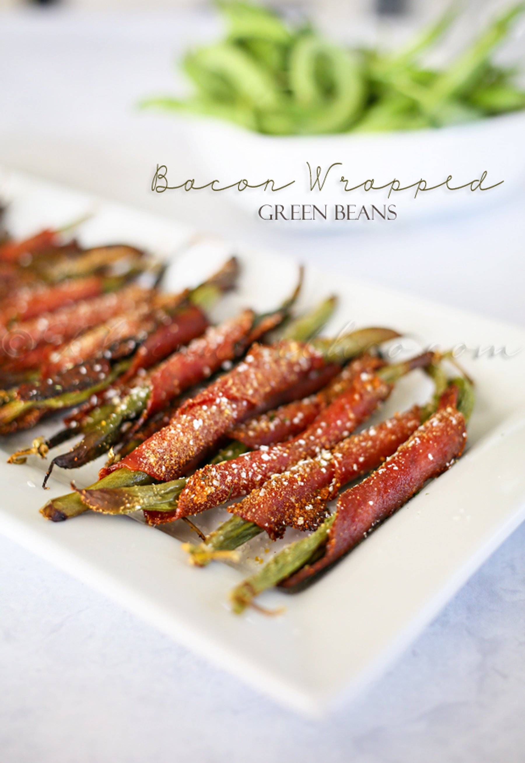 Take 1/2 piece uncooked bacon & wrap around 1 individual green bean & place on a large baking sheet