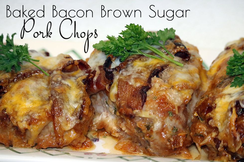 Baked Bacon Brown Sugar Pork Chops – these sweet, tangy breading glazed pork chops topped with bacon and a cheese blend are a perfect family dinner.