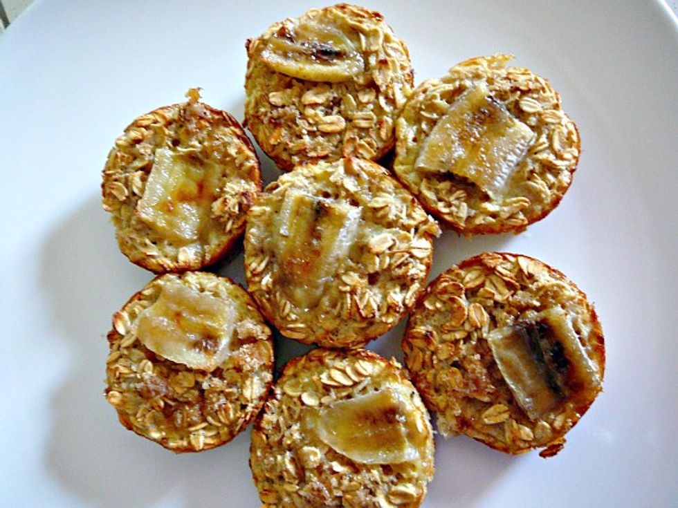 Slice one large banana and layer 1/2 the banana in a muffin tin coated with cooking spray (one slice per muffin or more if you have.)