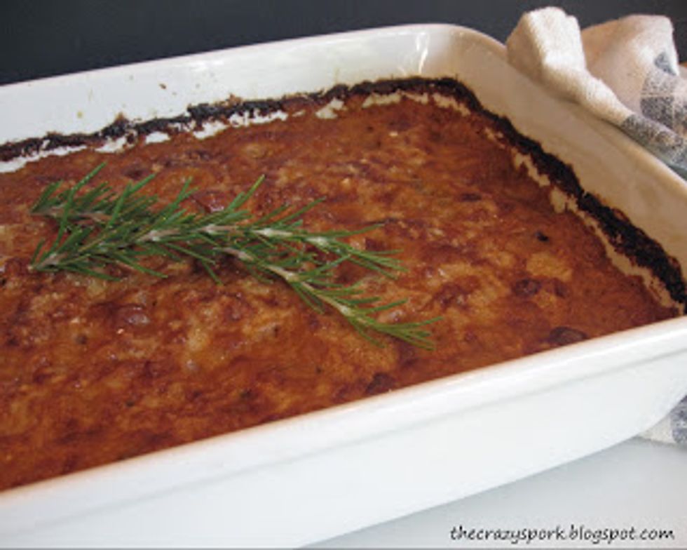 A savory baked bean dish with rosemary and fennel and a parmesan cheese crust. No sugary baked beans here!