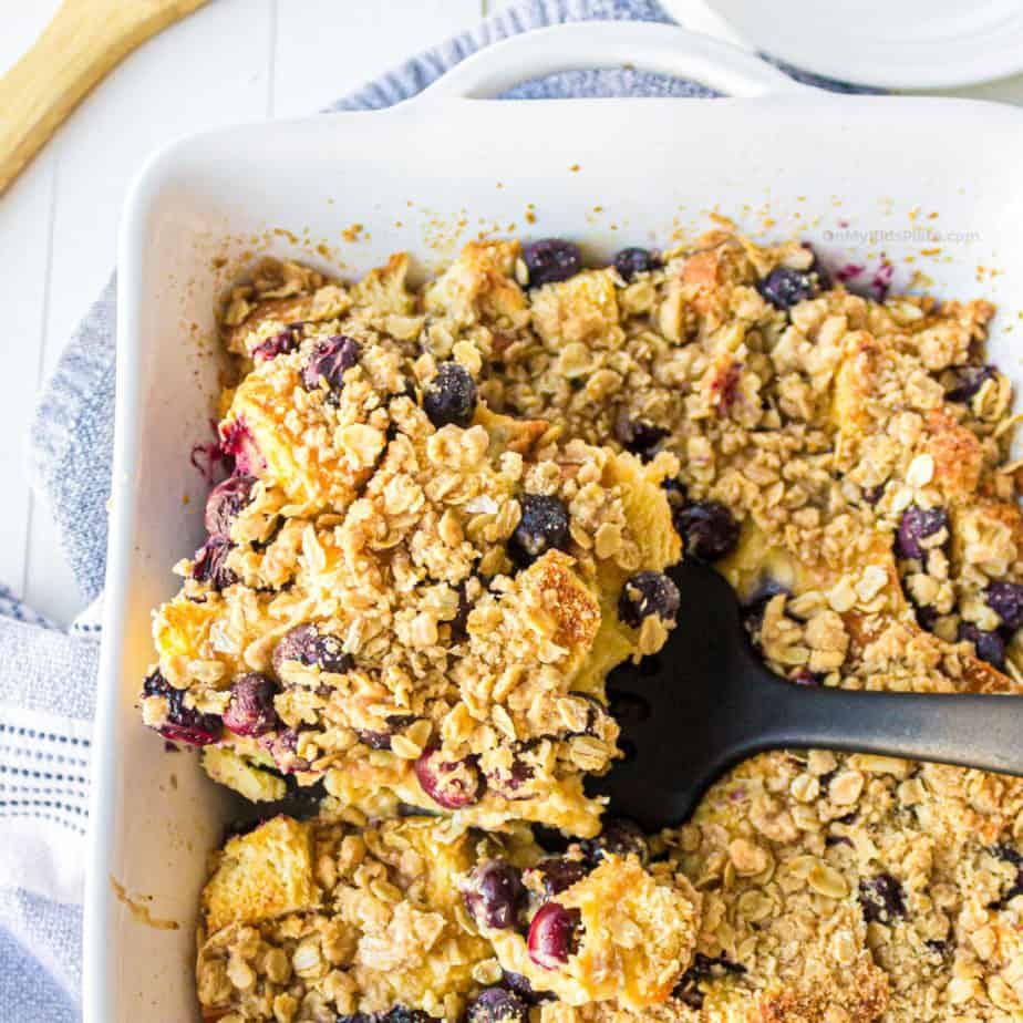 This delicious baked blueberry french toast casserole is the perfect weekend or holiday breakfast. Make it the same day, or make it ahead the night before for an easy breakfast in the morning that makes a tasty and sweet bubbling blueberry breakfast. The whole family will come running, just drizzle with maple syrup at the table and dig in!