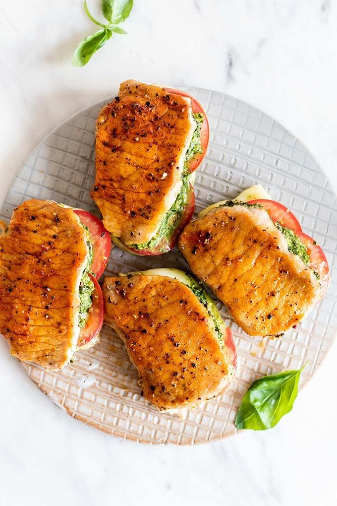 These healthy Baked Boneless Pork Chops have a fun twist — a caprese filling! Spice up your stuffed pork chops with pesto, tomatoes, and mozzarella. Easy, fun, and tasty family dinner.