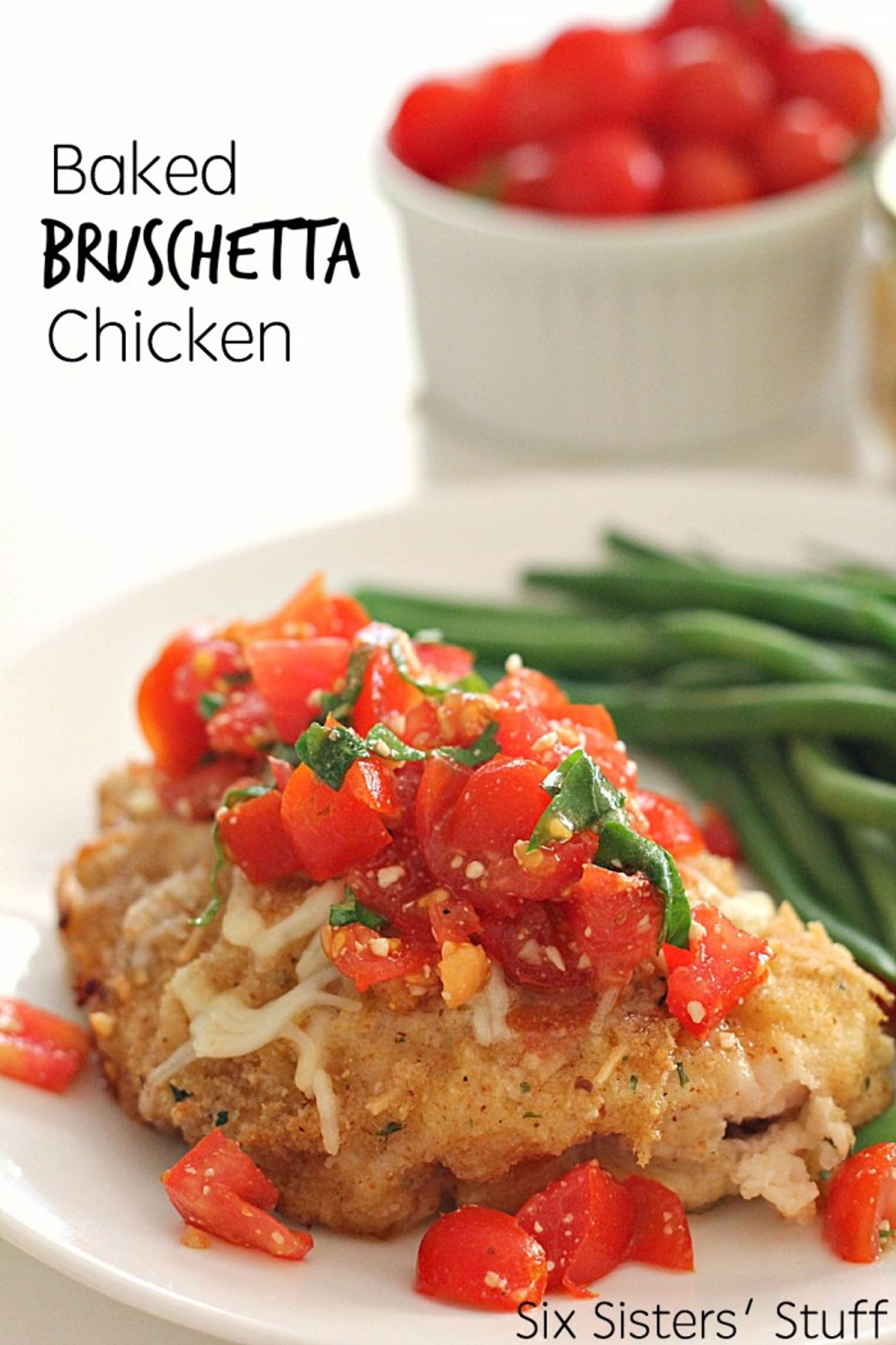 Tomato season is here! We planted a couple of cherry tomato plants in our garden this year and they have gone gang-busters! We have tomatoes coming out our ears, so I needed something for dinner that used up a lot of tomatoes. This bruschetta recipe is absolutely the best- the flavor is incredible! Throw it on some baked breaded chicken and you have an amazing meal! Even my kids gobbled this up, so it was a big hit with everyone.