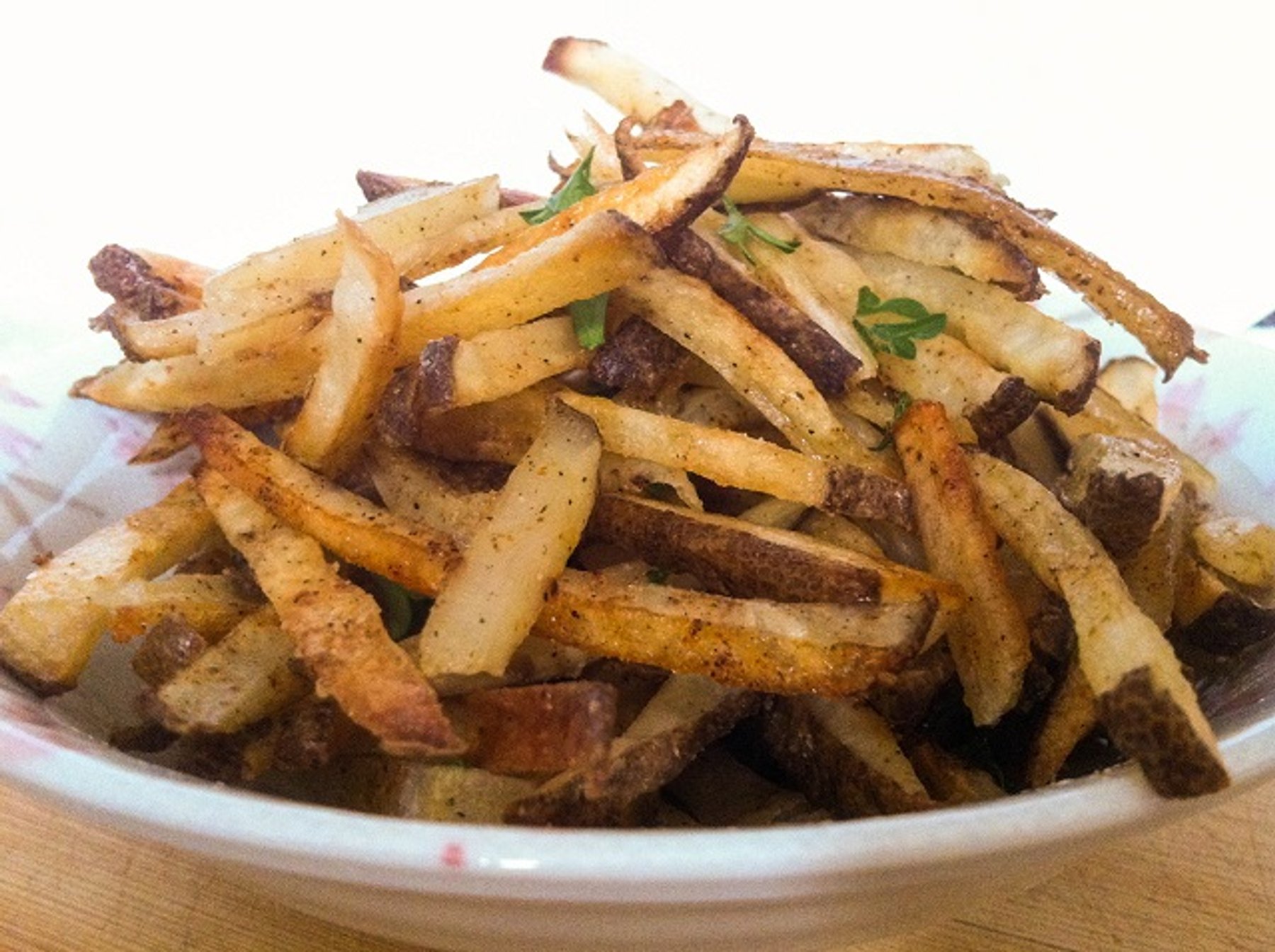 Preheat the oven to 425oF. Line a baking sheet with foil and grease the surface with olive oil or nonstick cooking spray. Don’t skip this step. Otherwise, the fries will stick to the foil.