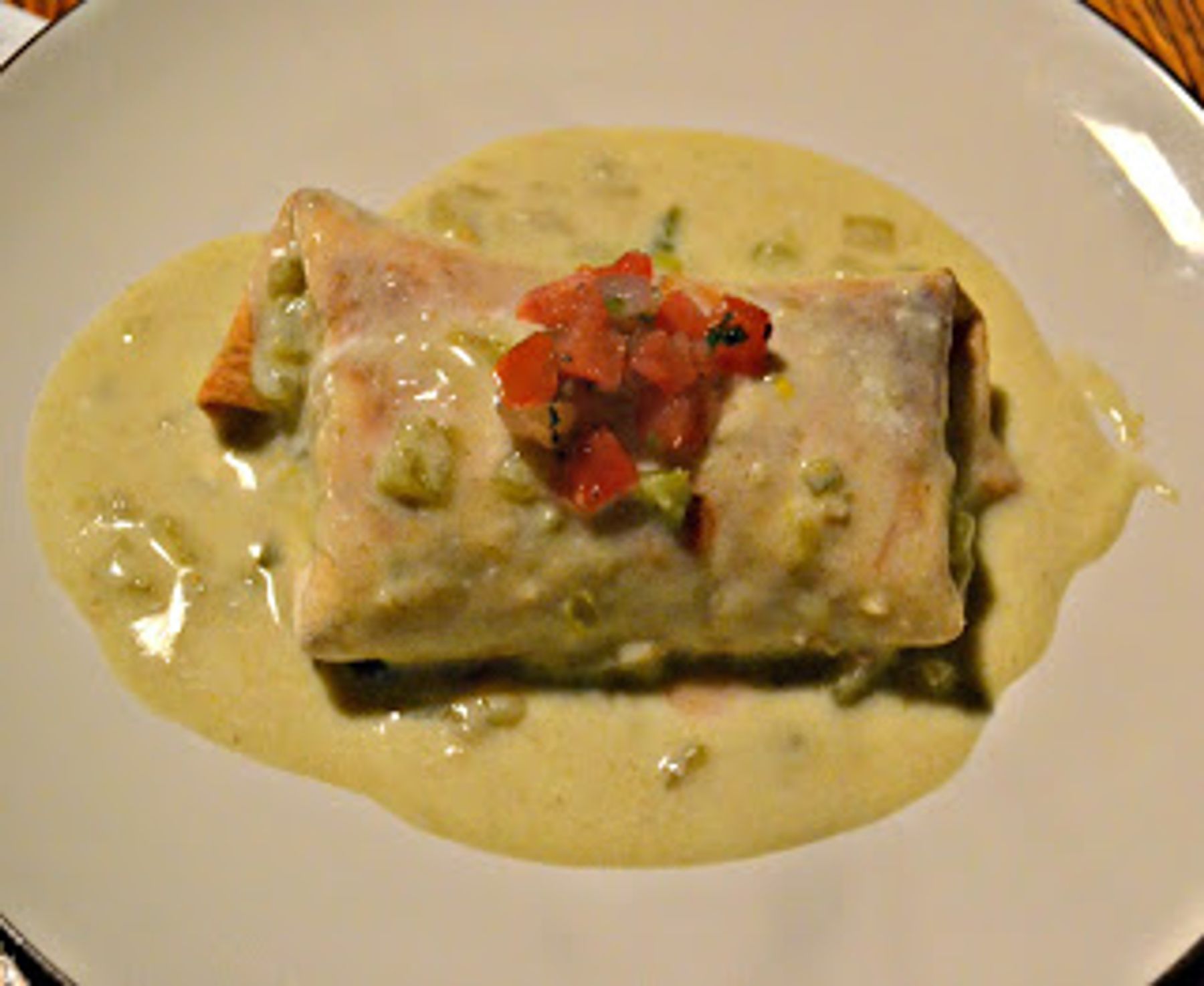 Chimichangas stuffed with chicken, cheese, and tomatoes and topped with homemade tomatillos.