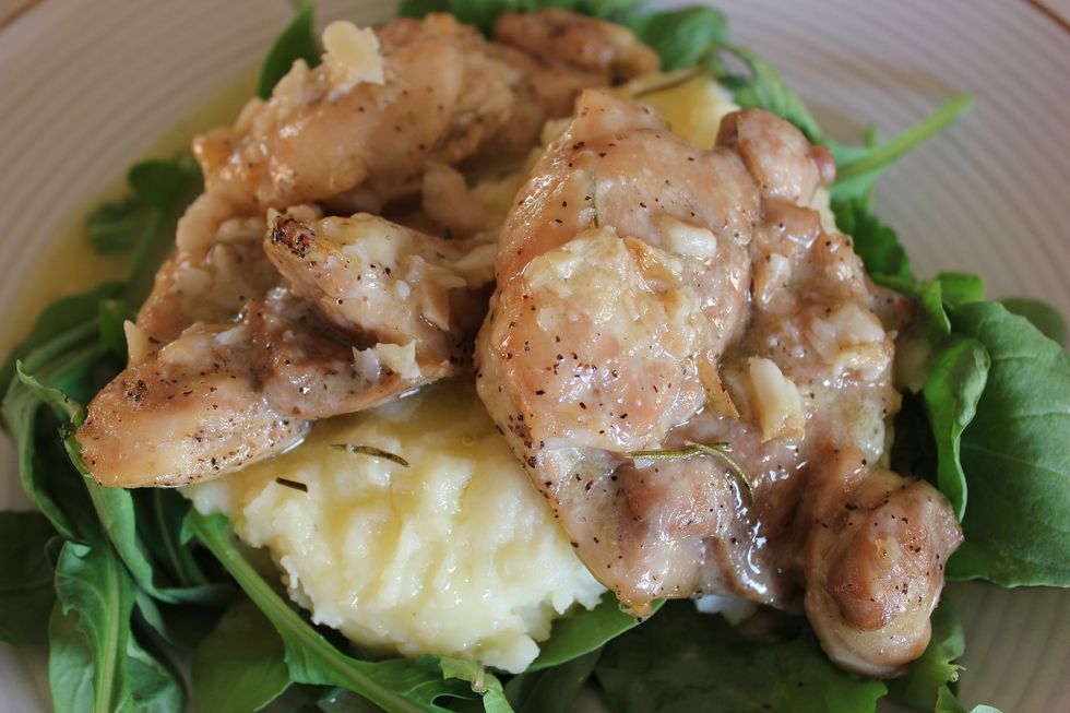 Add the olive oil, garlic cloves, chicken thighs and rosemary to a baking dish