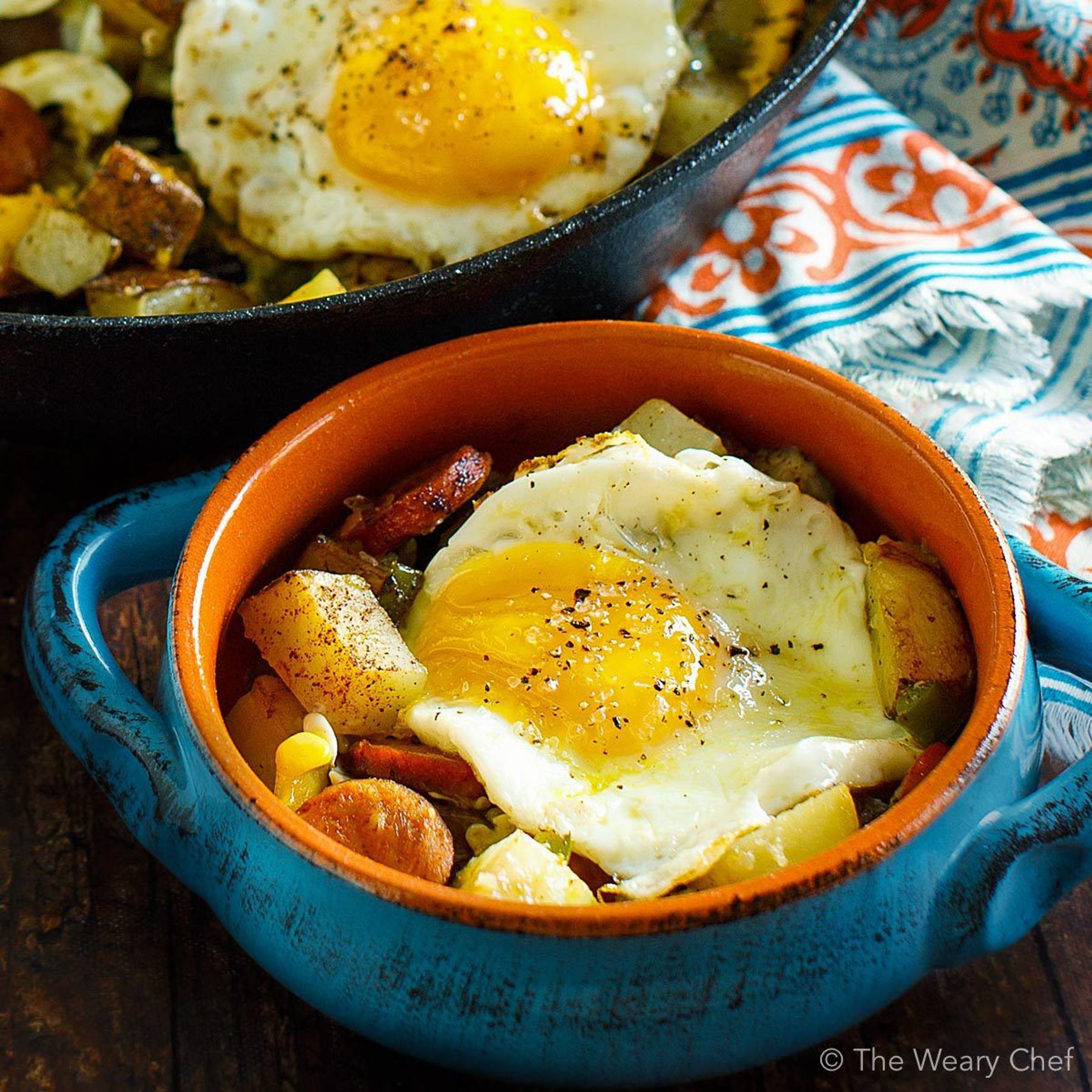 Baked Eggs over Roasted Potatoes and Sausage - The Weary Chef