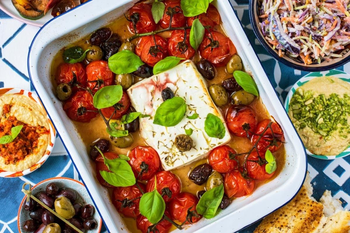 This super easy Baked Feta with Tomatoes has all the Greek flavours you know and love in a simple one pan dish. A block of feta cheese, with olives, tomatoes, garlic and herbs all come together in a meal that is perfect for sharing. Just put it out on the table with some crusty bread and let everyone dig in.