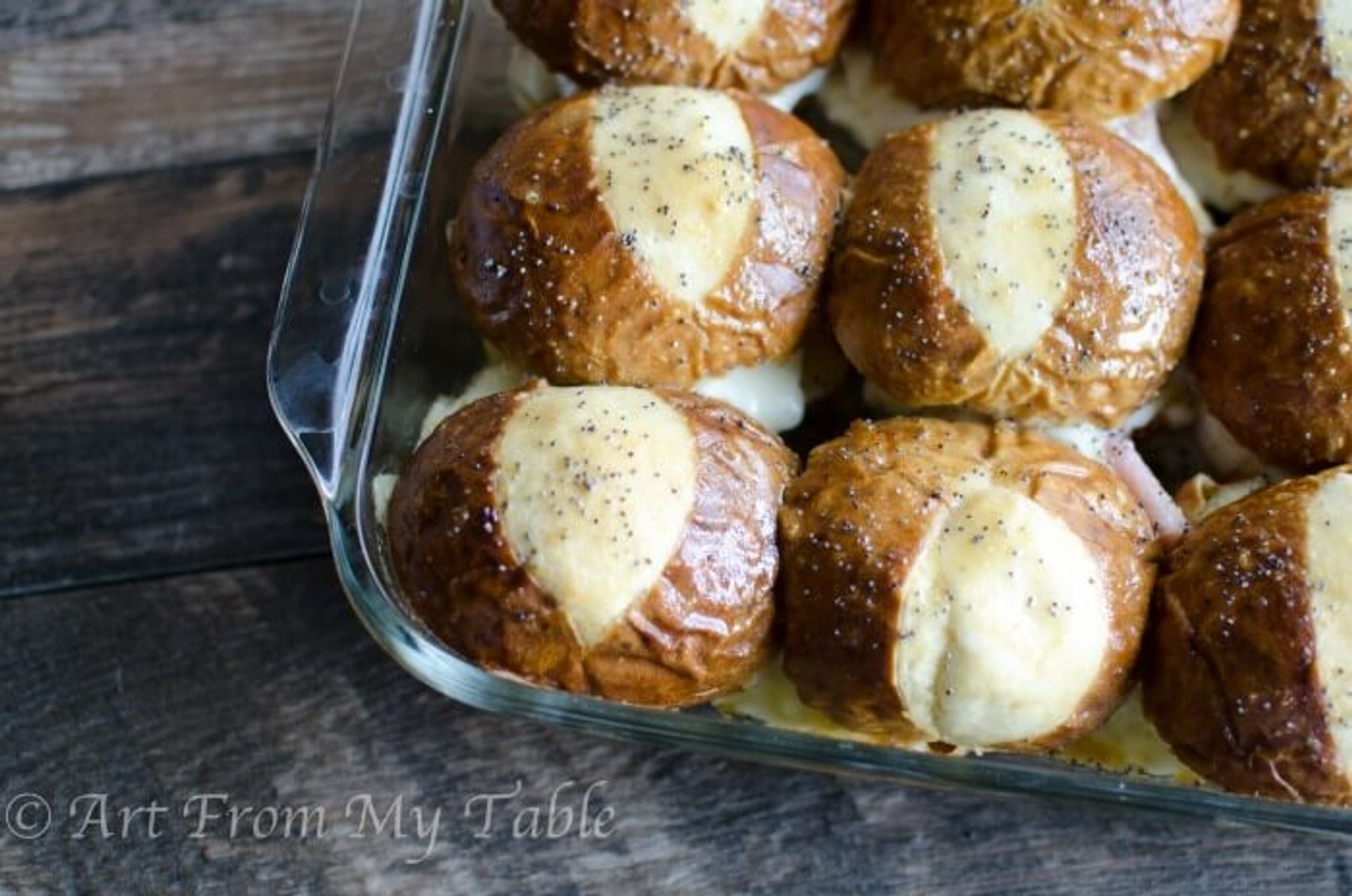 Layer ham and cheese on the bottom half of each pretzel bun, and place the top half on top.