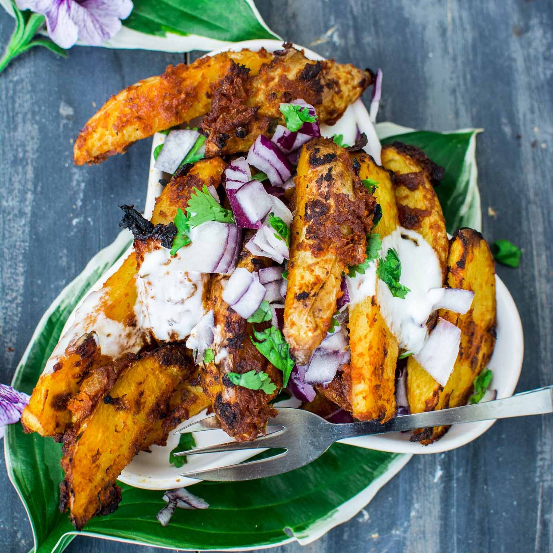 Baked Masala Potato Wedges | Indian Spiced Crispy Potato Wedges Recipe. Simply bake the masala coated wedges. Then the natural yogurt gets drizzled over the baked potatoes. A sprinkle of chopped onions and cilantro, and a splash of lemon juice. Done.