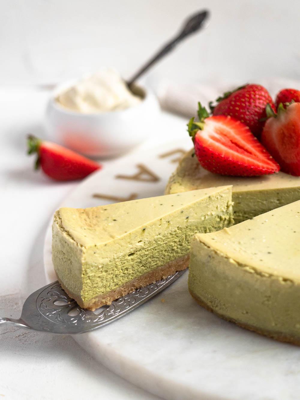 Smooth and creamy baked matcha cheesecake with a buttery base. This two-toned green tea cheesecake is rich and delicious.