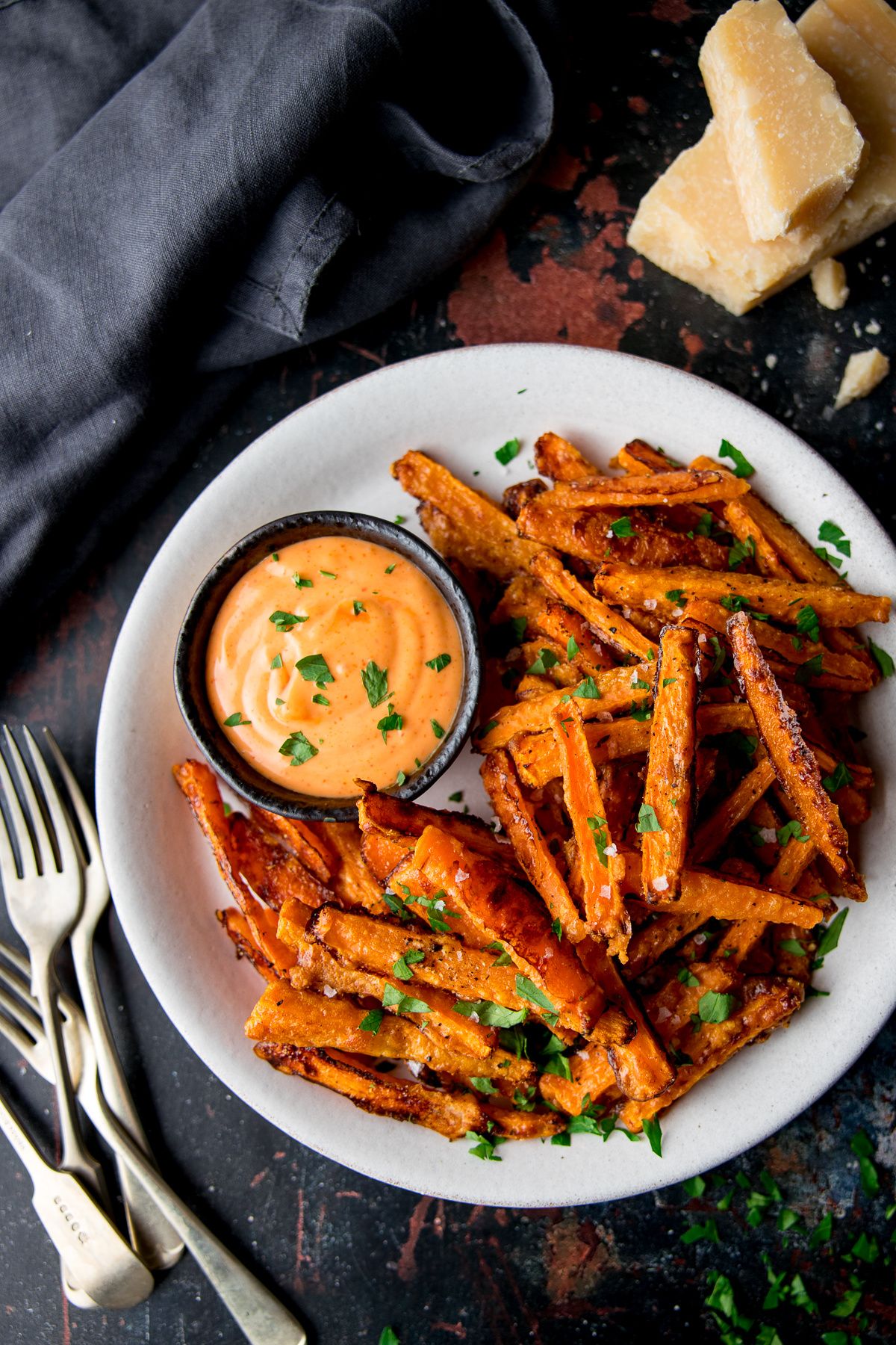 Baked Parmesan Carrot Fries Nicky CorbishleyJune 19, 2020 455 Kitchen SanctuaryCrunchy cheesy baked carrot fries with a spicy, creamy dip - great as a lunch, side dish or appetizer!Baked Parmesan Carrot FriesSee the full directions on my site
