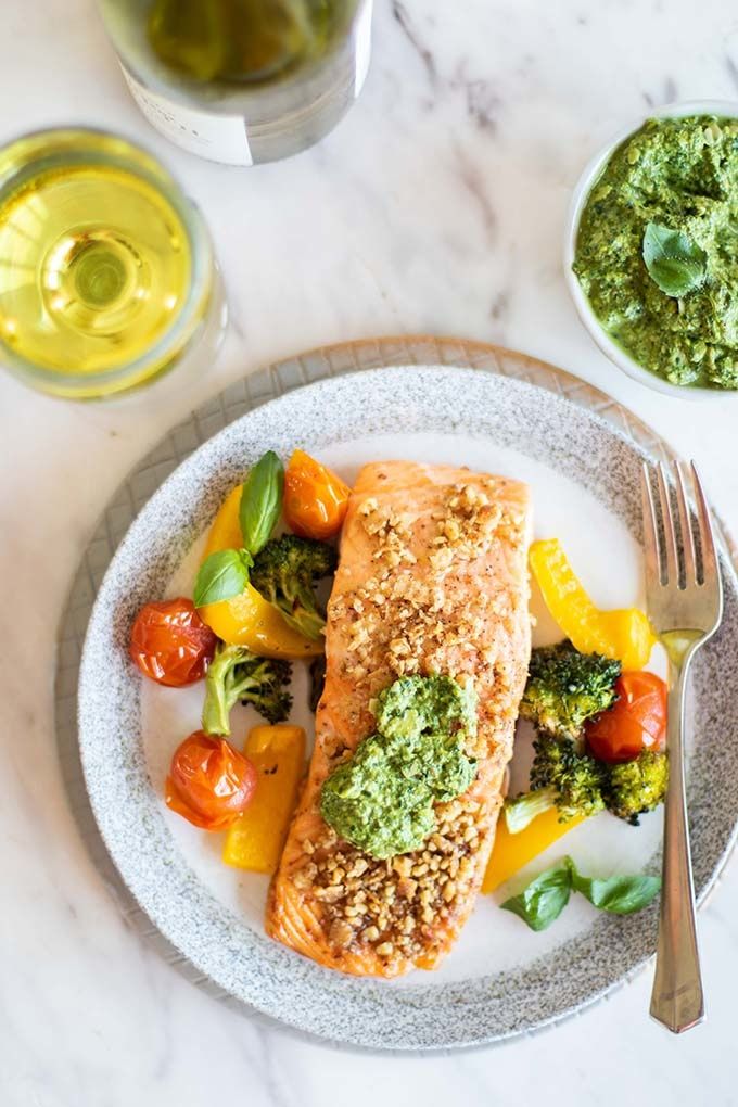 A healthy Pesto Salmon Recipe, baked with a delicious walnut and parmesan crust. Serve this healthy baked salmon recipe with veggies and a homemade pesto sauce for a low carb, keto and gluten free dinner.