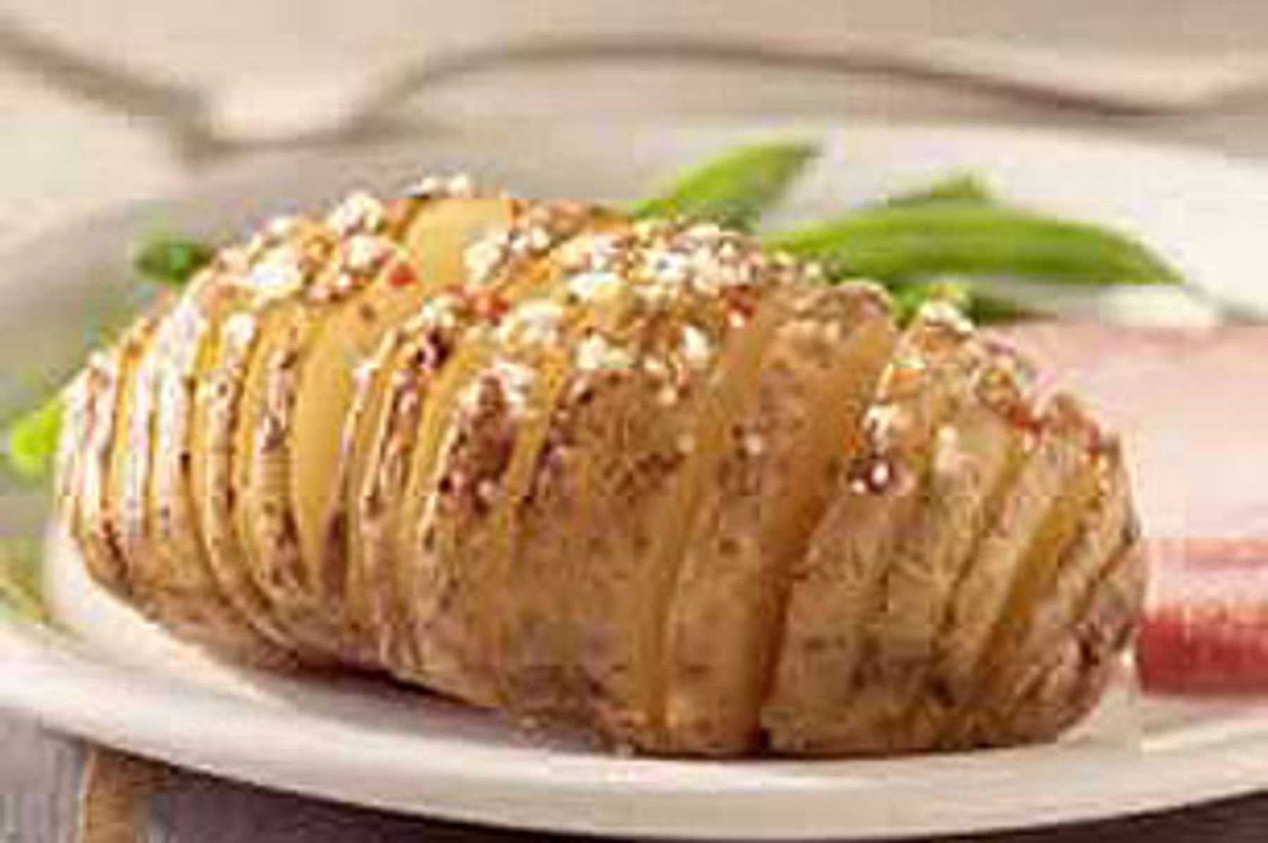 Scrub, rinse and dry potatoes. (Note: Potatoes only need to be peeled if skins are tough (as with Russet potatoes. Golden potatoes do not need to be peeled). Keeping potatoes in whole form, cut into 1/4-inch-thick slices almost all the way through to the bottom. (Tip: To avoid cutting potatoes all the way through, place the handle of a wooden spoon next to the potato to stop the knife from cutting too far.)