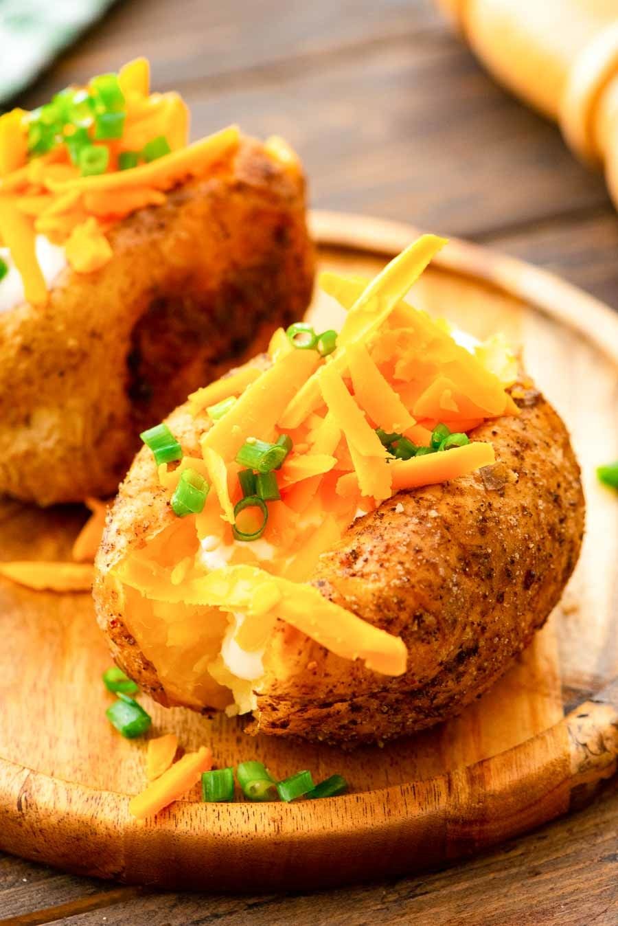 Baked Potato is a simple side dish that everyone loves and wants to master! The salty, crispy skin on the outside, light and fluffy on the inside is what the perfect baked potatoes is made of! Top it with butter or go all out and load it with sour cream, cheese bacon and more! We will teach you how to make the perfect baked potatoes in the oven to serve as a quick and easy side dish during the week or when you have guests over!
