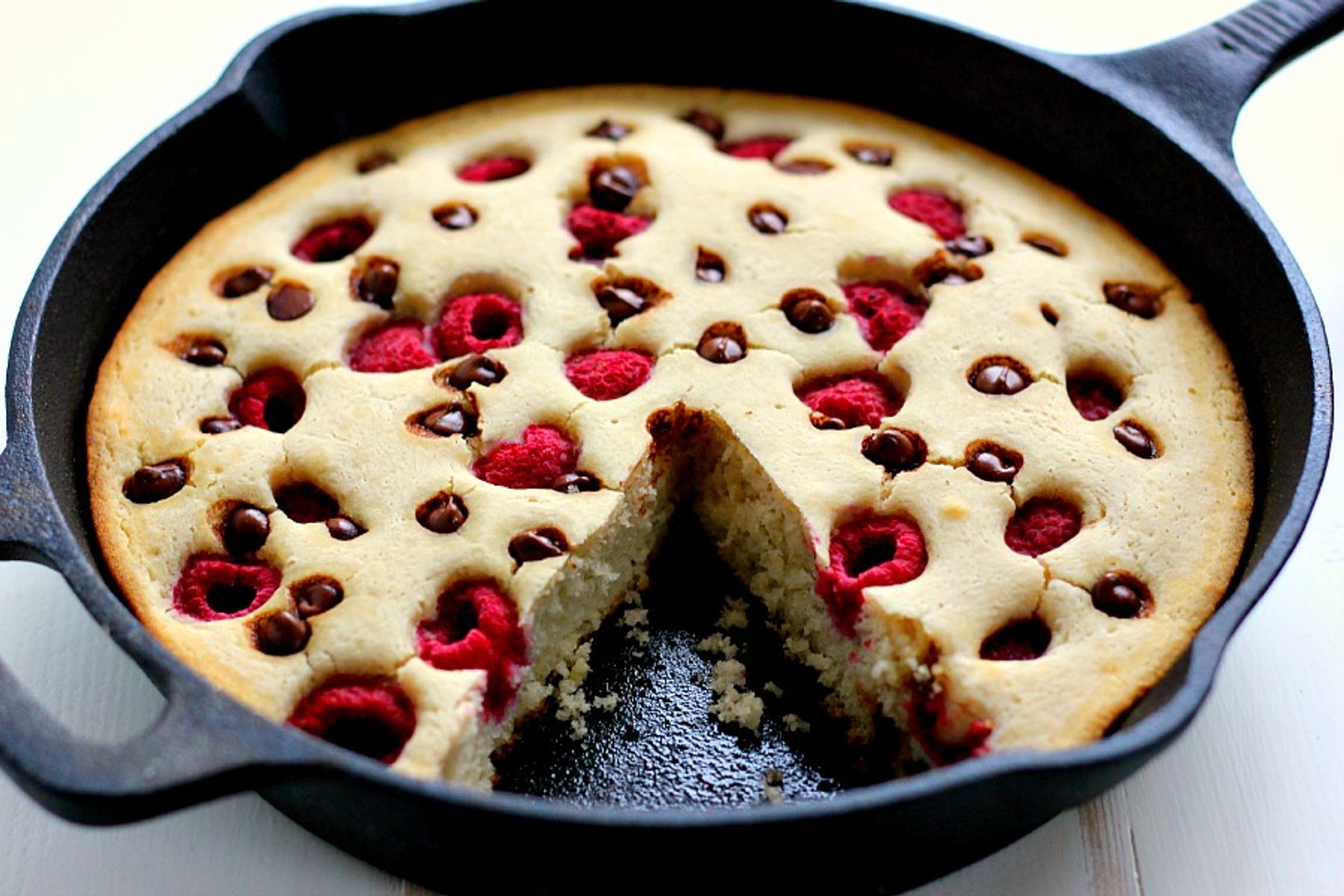 This Baked Raspberry Chocolate Chip Pancake is fluffy, light and bursting with fresh raspberries and chocolate chips!