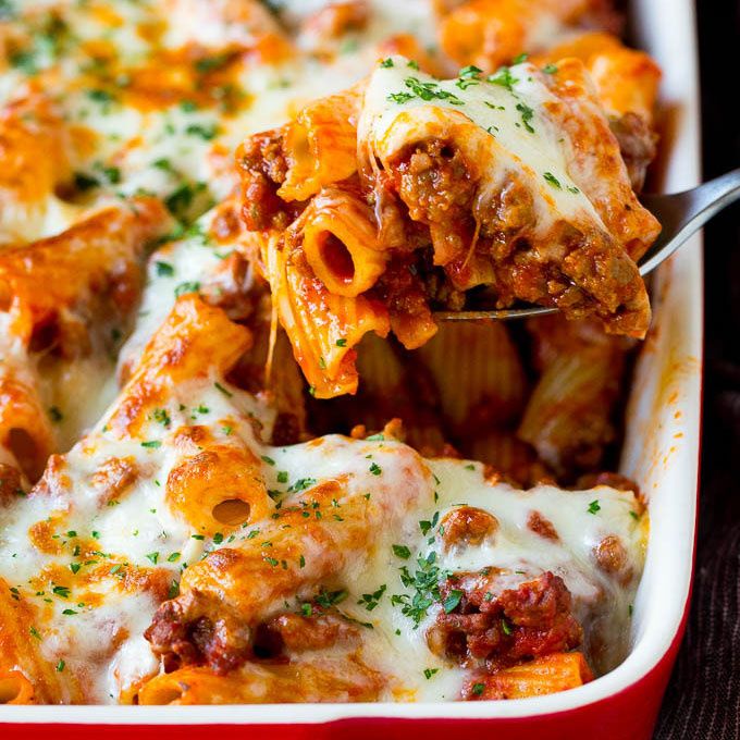 This baked rigatoni recipe is pasta tossed in a flavorful meat sauce, then topped with plenty of cheese and baked until golden brown. A super easy dinner option that's great for feeding a crowd!