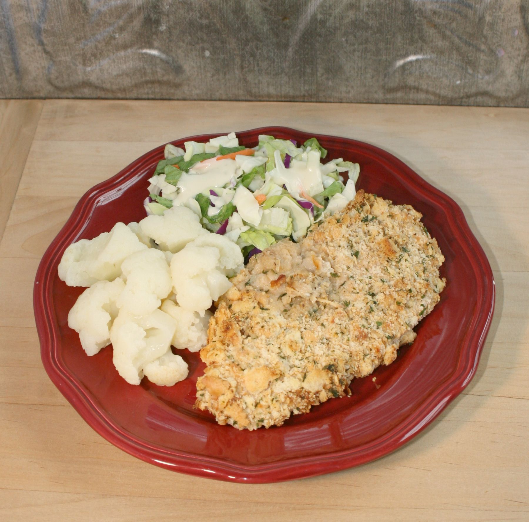 Place ritz crackers and all dry ingredients into a large ziplock baggie and crush the crackers into crumbs and small pieces. Make a breading station by placing sour cream on one plate and the cracker...