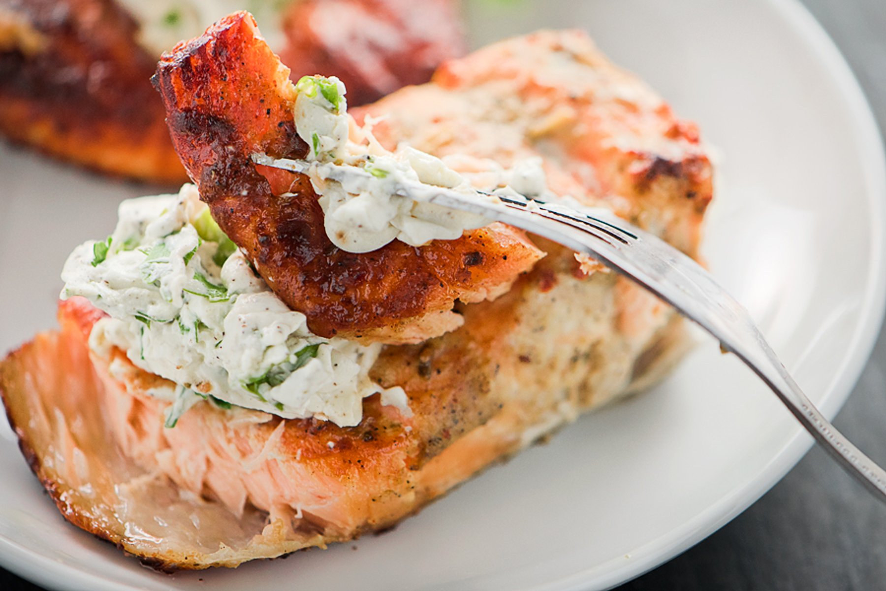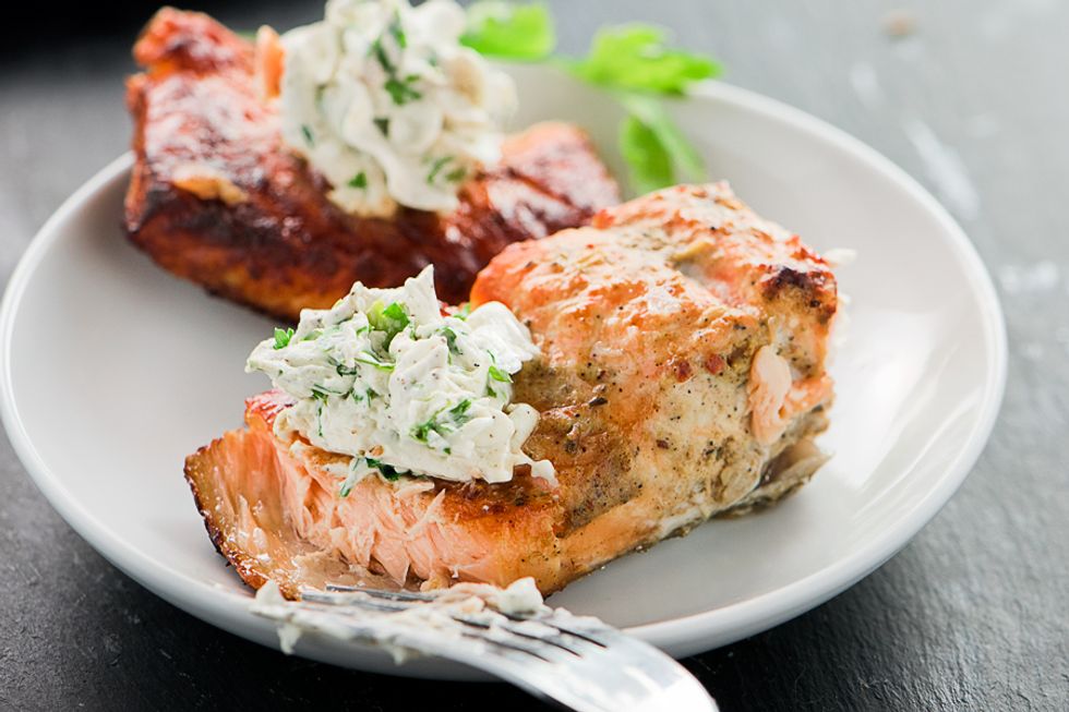 Baked Salmon in Mustard Sauce with cream cheese and fresh herbs( parsley/ dill)