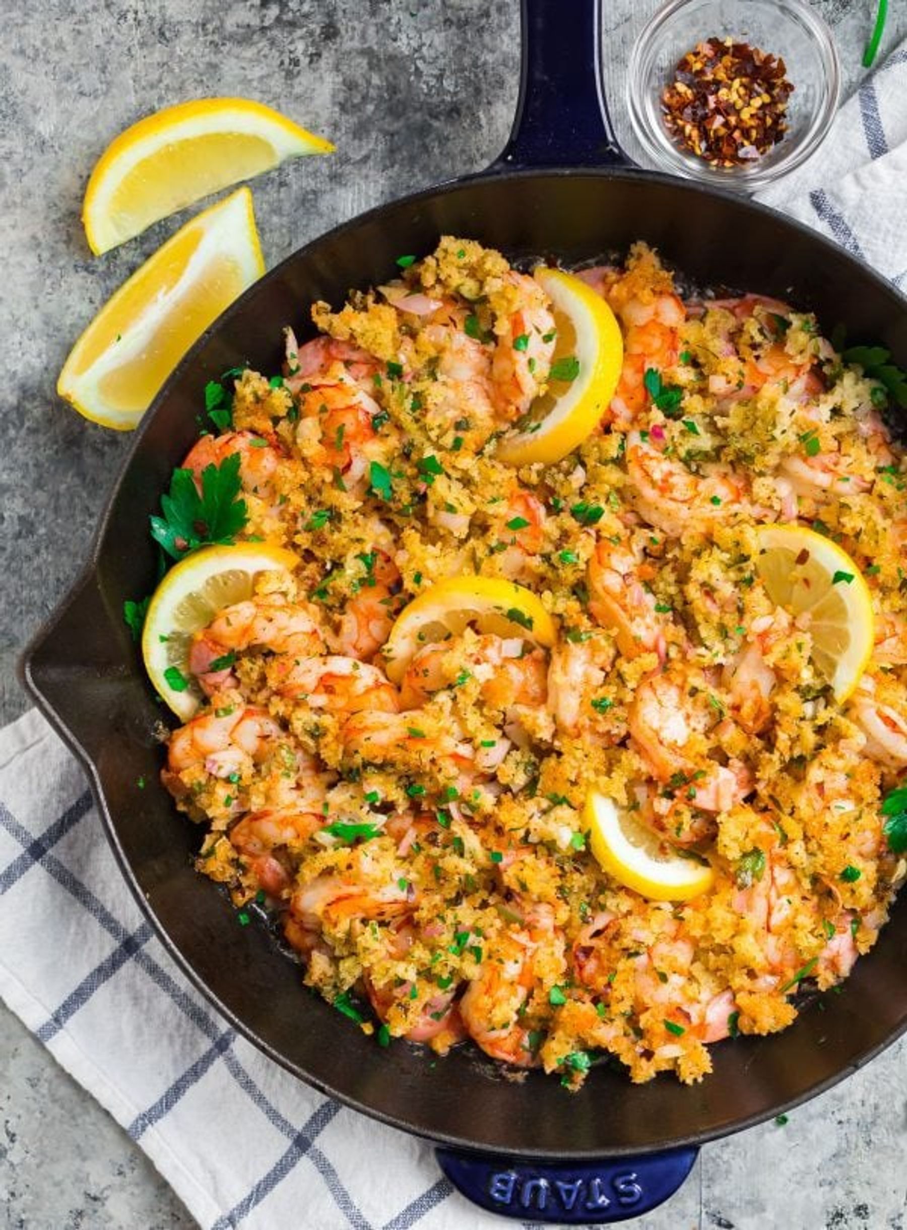 Time for a little low-maintenance fancy! This is Baked Shrimp Scampi with breadcrumbs. Itâs easy to make and is going to make you feel like a combination of Ina Garten, Julia Child, and the kind of person who calmly greets guests with a glass of wine in hand because she had dinner prepped hours ago. If you are asking yourself if what is effectively a gussied up, garlicky baked shrimp casserole really accomplish all that, the answer is OMG YES. You see, when you toss shrimp with lemon, then top said shrimp with a thick layer of panko bread crumbs