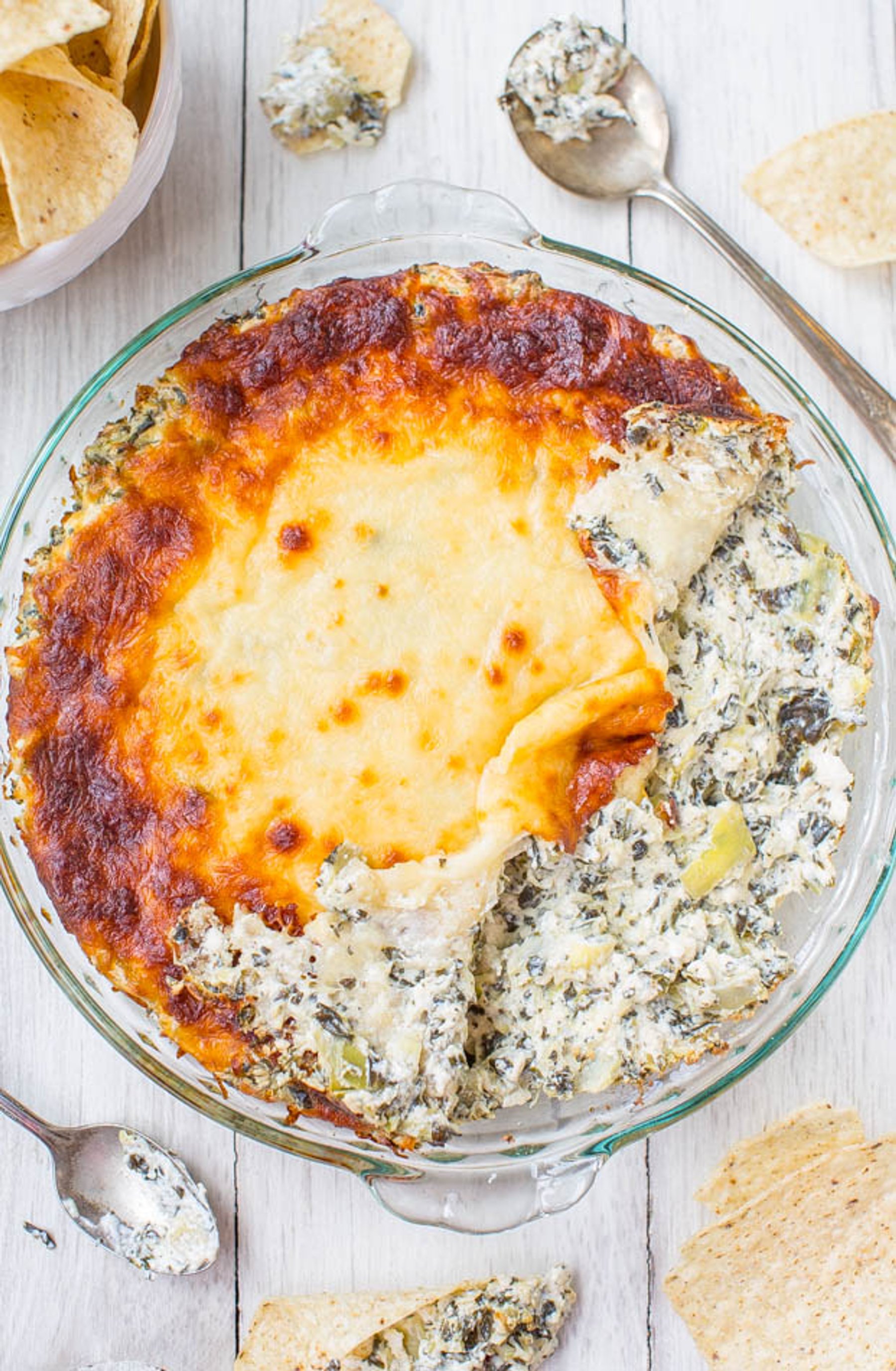 The dip is creamy, cheesy, gooey, and everything I want in a baked spinach and artichoke dip. While the dip is amazing fresh