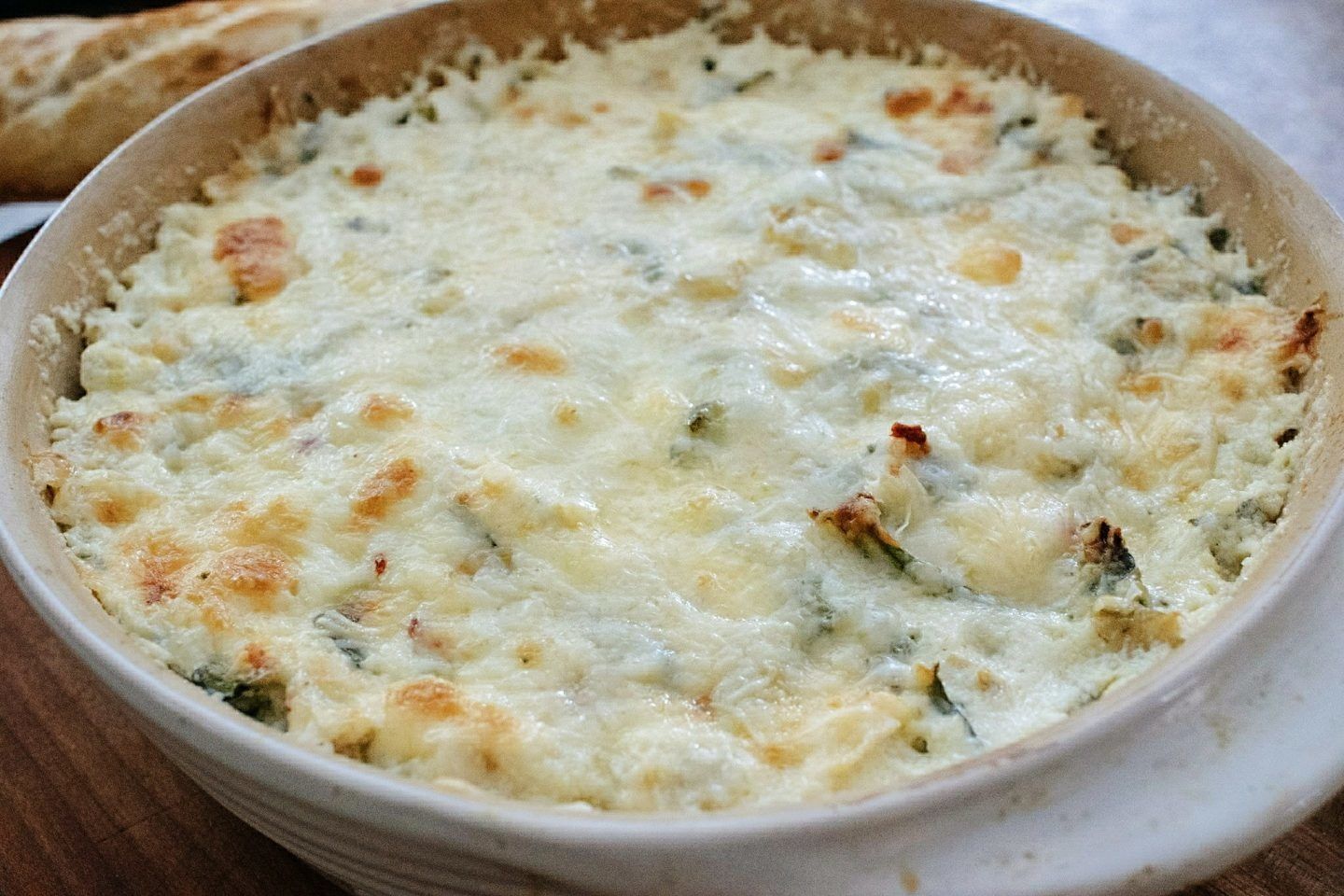 Serve this Baked Spinach Artichoke Dip right out of the oven for an instant win! Parmesan and pepper jack cheeses are sprinkled on top and melted into a perfectly crispy brown layer which adds even more flavor to this delicious dip. Its my favorite part! Serve with baguette slices, your favorite chips or cut up veggies.