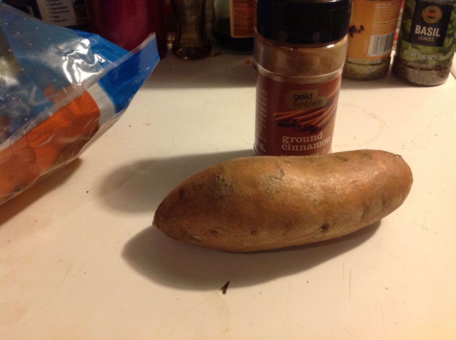 1. Puncture your sweet potato a few times with a fork and put in a 400 degree preheated oven. This depends on the size of your sweet potato, but leave it in until tender and the skin is about to fall off (took me about 40 minutes).