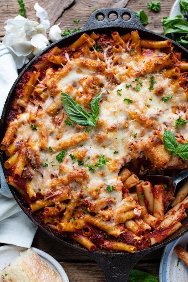Baked ziti with sausage, three types of cheese, and homemade marinara sauce is a classic pasta bake that's pure comfort food! Pair the hearty, satisfying casserole with a Caesar salad and garlic bread for the ultimate family meal. It's also an easy make-ahead dinner for busy days!