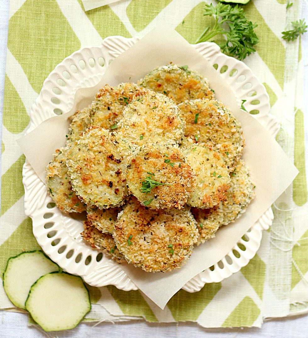 Delicious crispy Parmesan baked zucchini chips (courgette crisps or zucchini fries) baked with egg, flour and gluten free bread crumbs. Serve this healthy baked summer squash as an appetizer, healthy snack or side dish!
