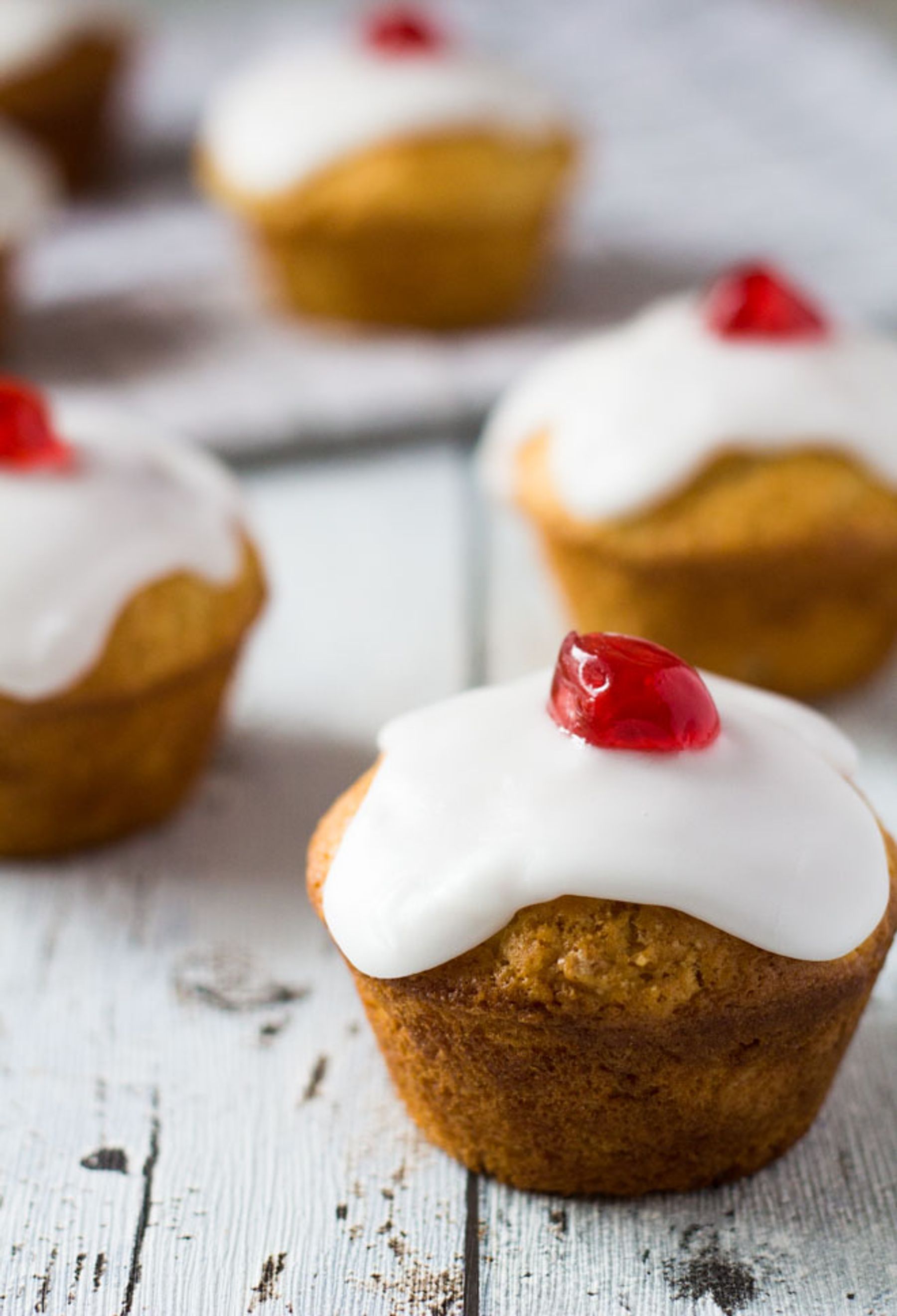 Moist and tender almond flavoured muffins filled with raspberry jam, and topped with almond icing and Glacé cherries!