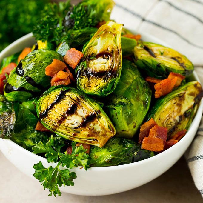 https://www.dinneratthezoo.com/balsamic-brussels-sprouts/These balsamic brussels sprouts are roasted brussels sprouts with crispy bacon, all topped with a sweet balsamic glaze. An easy yet elegant side dish that always gets rave reviews!