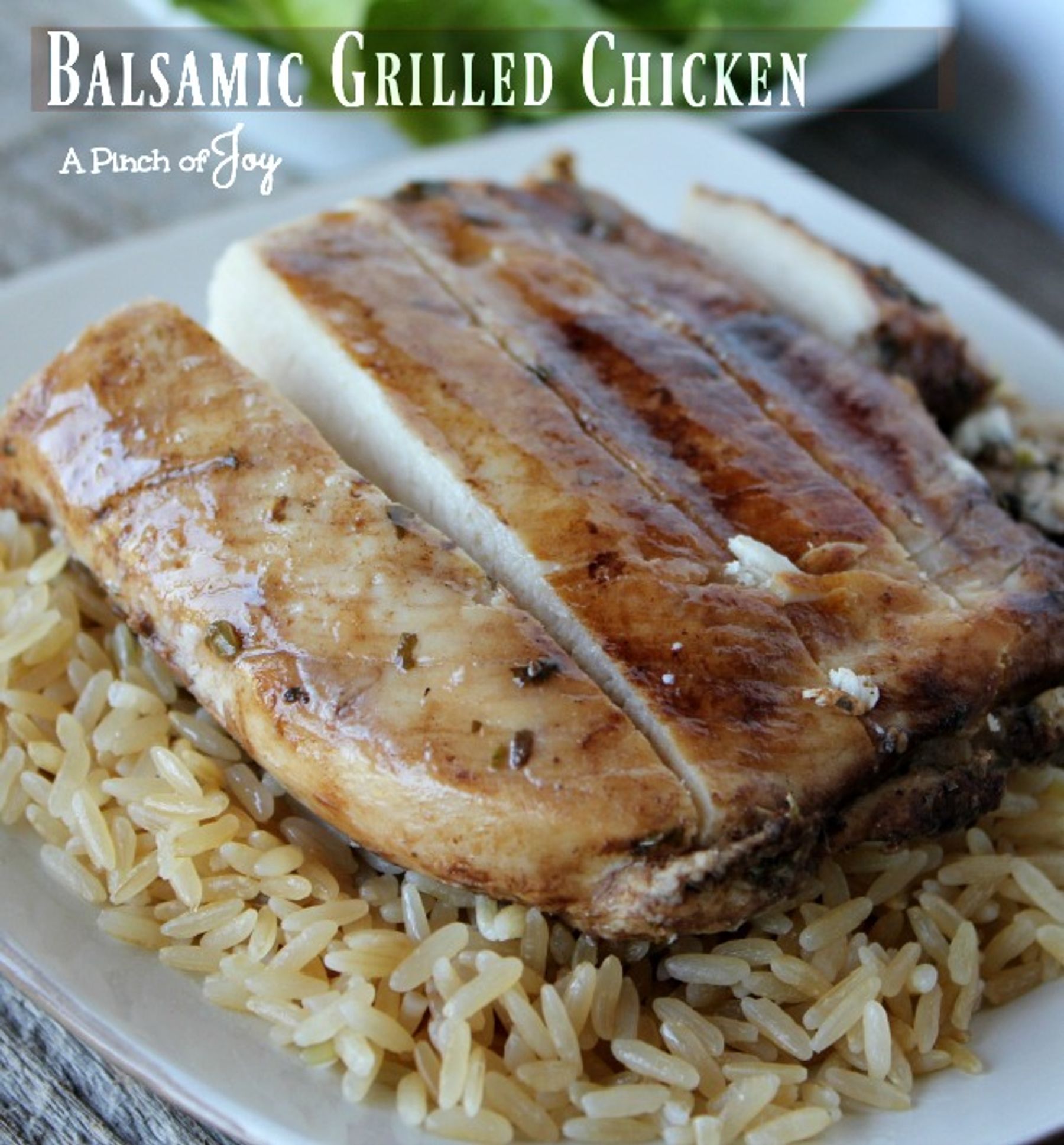 Tender grilled chicken with a little bit of balsamic tang to liven up the flavor of a nicely balanced mixture of herbs. Make ahead and freeze. Marinate and cook the same day. Place slices, warm or cold, on a bed of lettuce for a great salad