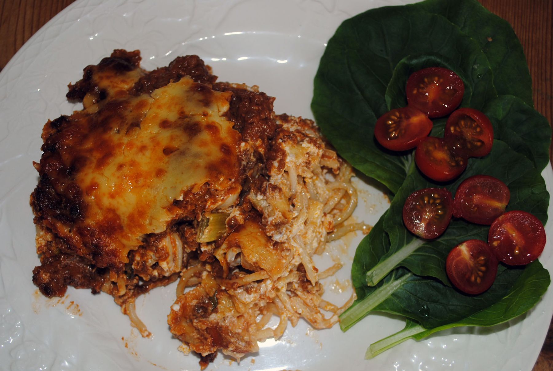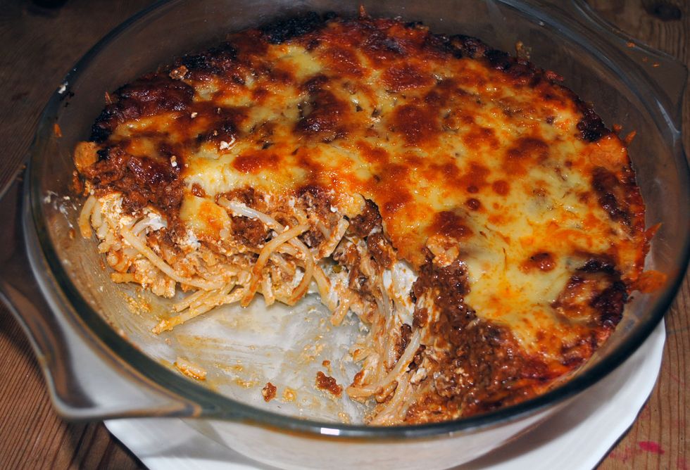 In a casserole dish put half of the spaghetti followed by a layer of half of the cream cheese mix, then a layer of half of the mince, repeat layers and finish with the grated cheese.
