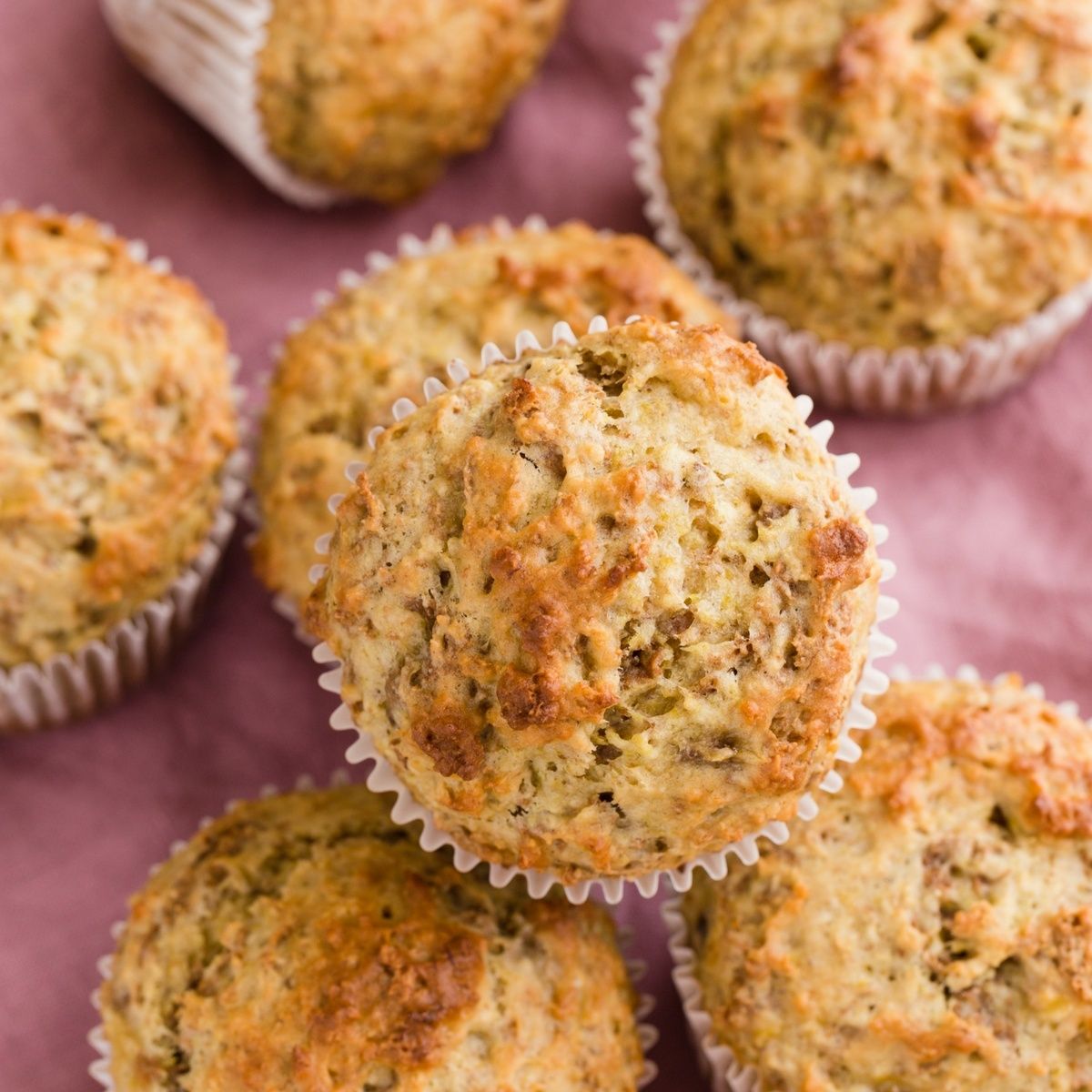 Banana Bran Muffins sweetened with mashed bananas and a significantly reduced amount of sugar, chock-full of moisture from low-fat milk and yogurt, and packed with bran cereal and wheat germ!