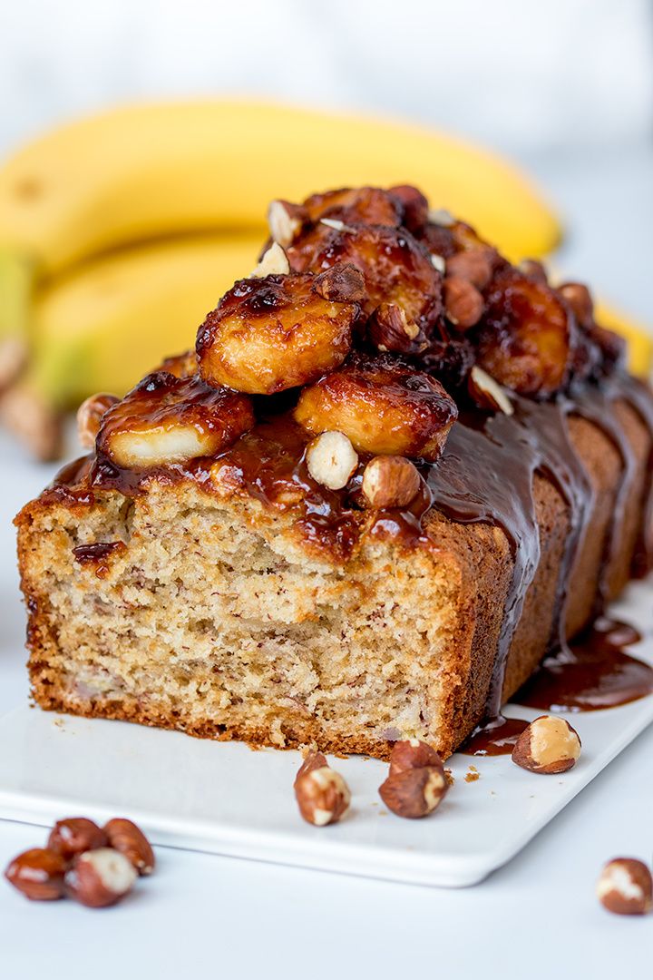 Fluffy, tender banana bread topped with piles of caramelized bananas, caramel sauce and hazelnuts. The BEST way to use up those bananas.