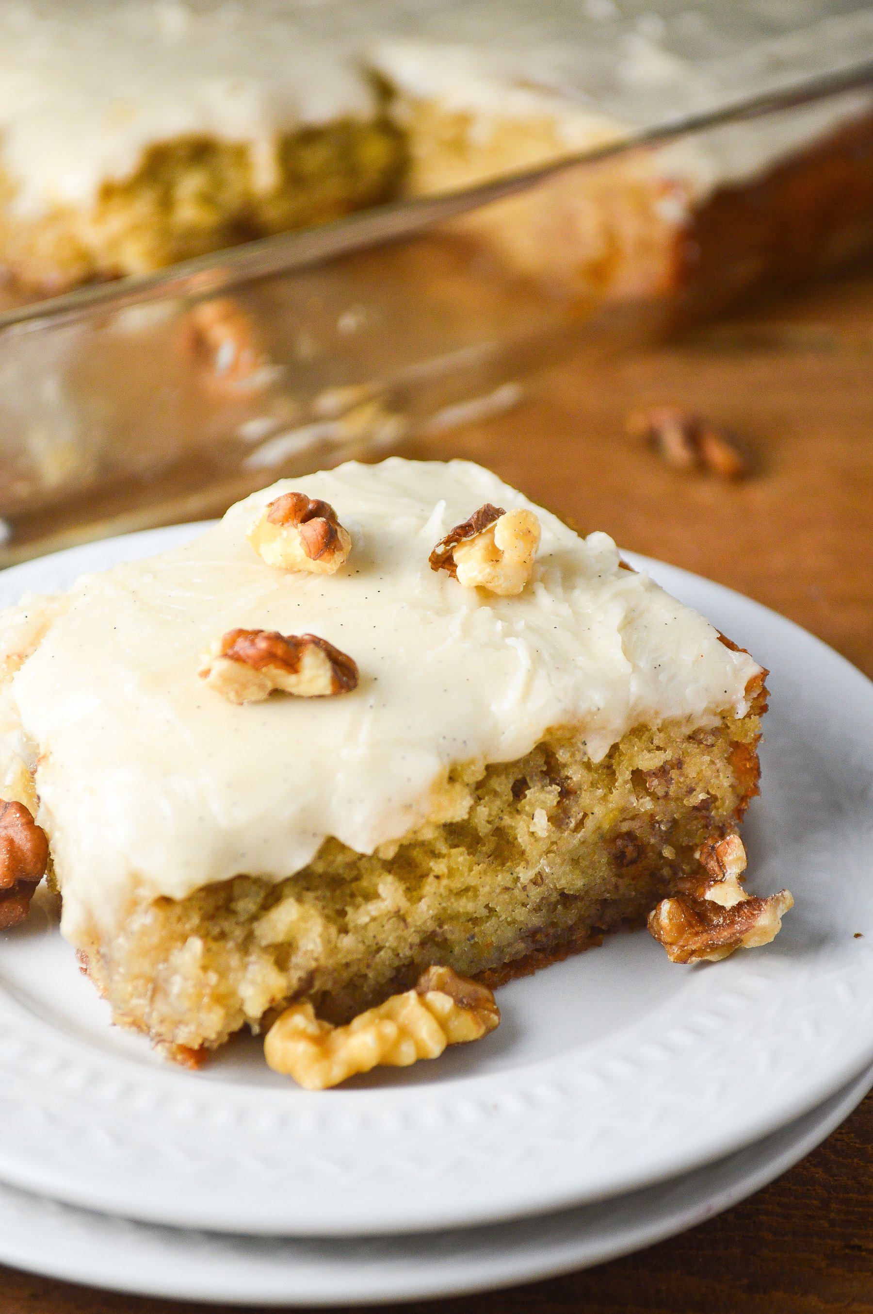 A sweet yet light banana cake topped with a browned butter vanilla frosting. Use Greek yogurt for richness, and over ripe bananas.